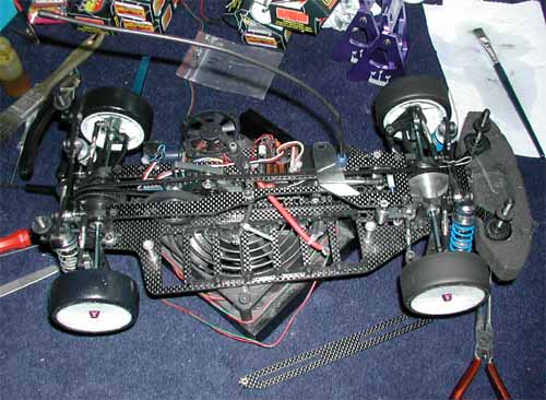 La Corally Assassin "Mid Version" de Walter Pollet-Villard.Une seule Corally Assassin présente, celle de Walter Pollet-Villard, en version "Mid". Sur sa voiture, on pouvait observer plusieurs news. Corally a ENFIN sorti un châssis plus épais (3.3mm au lieu de 2.5mm); une platine de la même épaisseur et moins évidée adoptant le même design que celle de la Mini-Assassin 1/12° devrait suivre. Sur la piste, la différence est flagrante, le châssis devenant plus prévisible et gagnant en précision. Il ne reste plus que des triangles dignes de ce nom pour rattrapper les références du moment. Les problèmes de casse à répétition des couronnes semblent avoir été solutionné par un nouveau bâti moteur. Celui-ci maintient mieux le moteur lors de l'accélération. Un support de couronne universel voit également le jour. Il assure un bien meilleur guidage que le risible prototype qui avait été présenté lors de la HPI/Orion Cup 2003 de Zillisheim, car les roulements sont montés sur une seule et même pièce, et non par la couronne comme le prototype. |