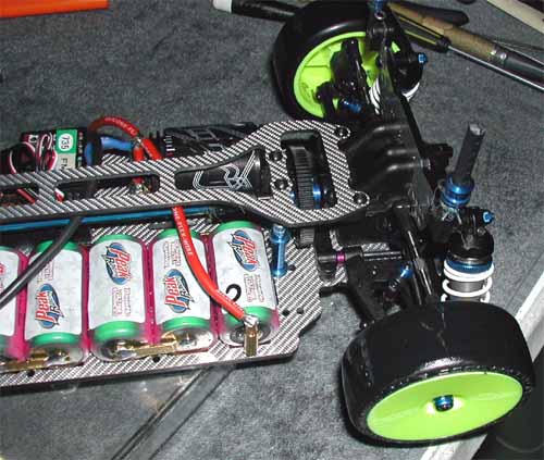 La Yokomo MR4-TC SD de Sébastien Leuenberger.Beaucoup de Yokomo présentes, comme à l'accoutumée, presque uniquement des SSG. Sur celle de Sébastien Leuenberger, on pouvait remarquer un support arrière installé à l'avant et une barre anti-roulis monté à la "Masami Hirosaka". L'implantation du servo est celle du kit, pas de retournement à 90°. |