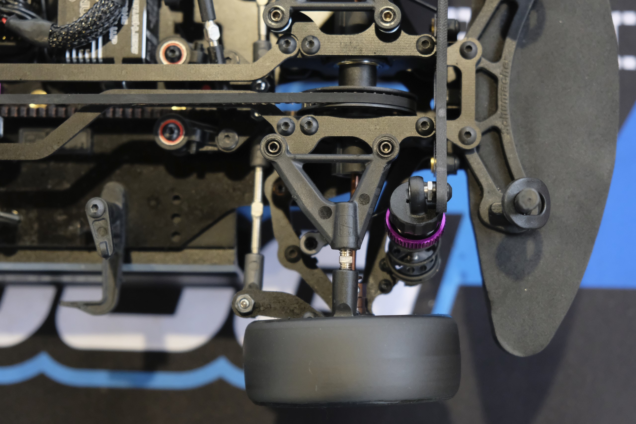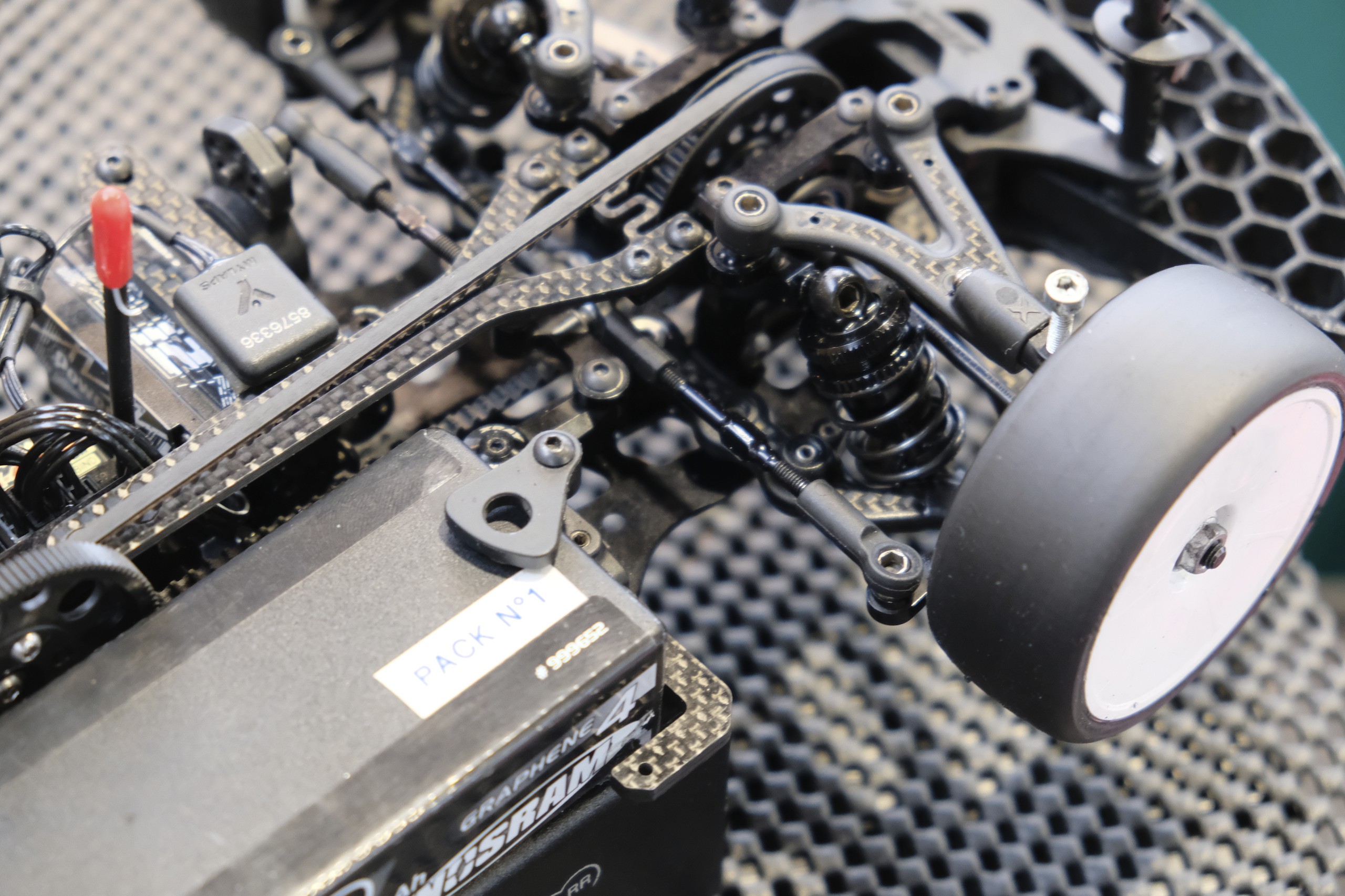 Technique châssis.La Team XRay X4 2026 de Benjamin Elbisser.La Team XRay X4 2026 est une des grosses nouveautés du début de la saison hivernale. Elle fait donc l'objet d'une présentation détaillée à la page suivante: "Présentation: la Touring Car 1/10° électrique Team XRay X4 2026". La Team XRay X4 2026 de Benjamin Elbisser, poleman et vainqueur de la finale A, en photos ci-dessous, est montée avec le châssis en aluminium et les triangles supérieurs à doubles biellettes On notera également la présence de visserie en titane à tête UFO et de biellettes à pas inversé et de bielletes en titane au niveau de la direction et de l'ARS d'origineT-Works. L'auto est équipée d'un moteur Orca brushless Boost Plus Outlow 17.5T, d'un contrôleur OE1 Mark II et de batteries LiPo de la même marque. Le servo de direction est un PowerHD S15-X, spécialement conçu pour les Team Xray X4. Il se distingue par l'absence de fixations d'origine, se fixant directement sur le châssis, et par une sortie de fil déportée vers la droite du boîtier, côté centre du châssis, permettant une installation plus propre de l'électronique. La partie radiocommande est confiée à une Sanwa M17S associée à un récepteur RX492i. |