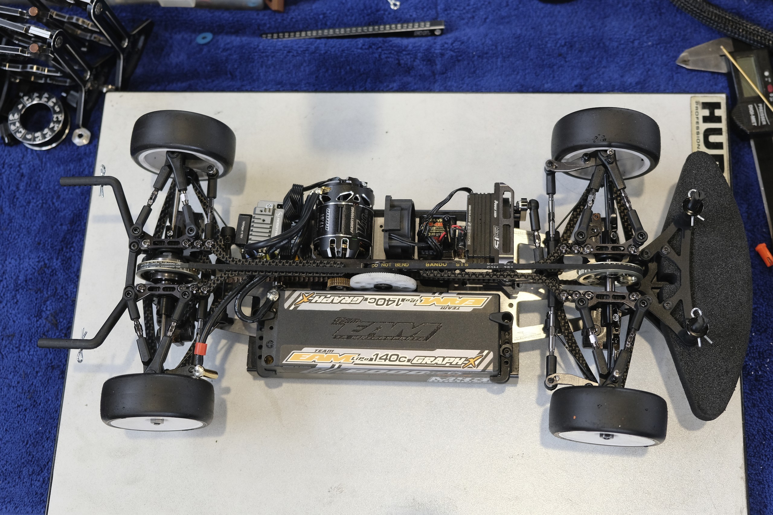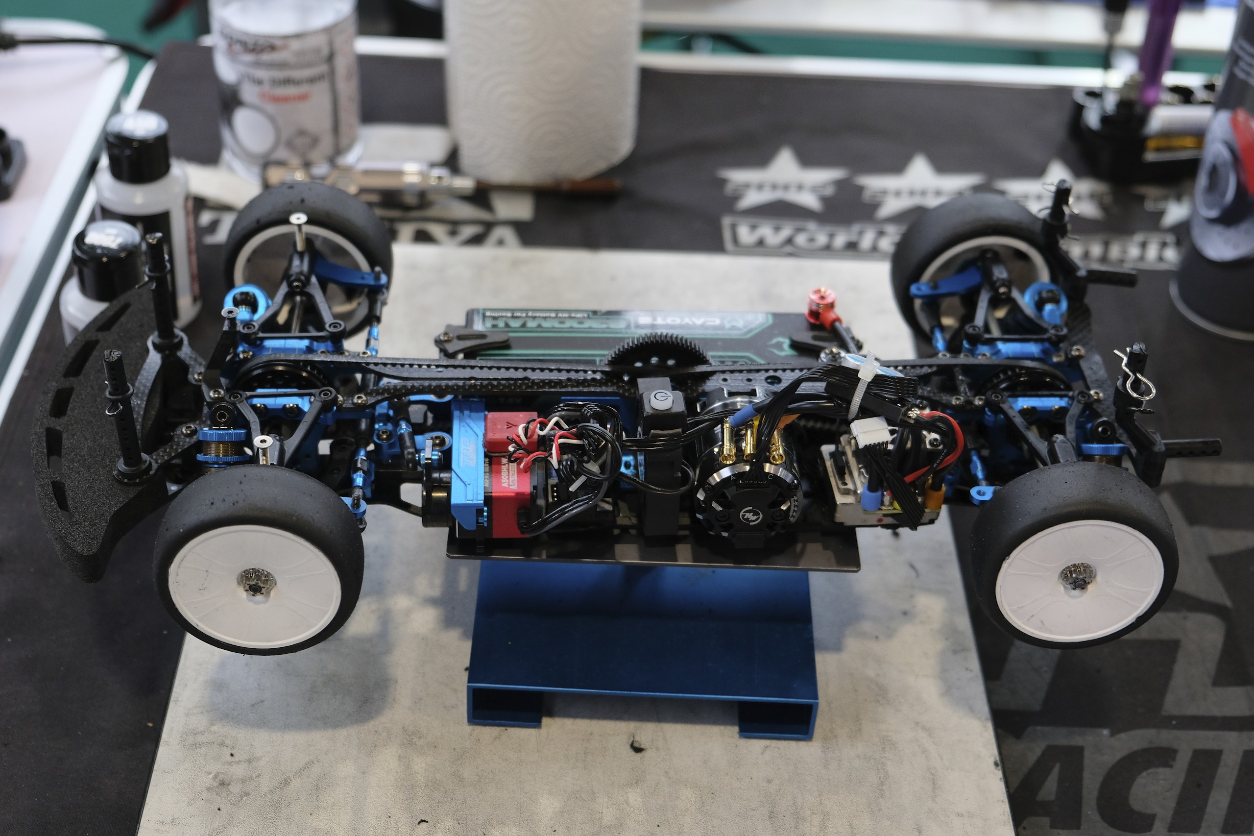 Une Team XRay X4 2025.La Team XRay X4 2025 avec châssis en aluminium ci-dessous est motorisée par un moteur brushless 17.5T Hobbywing Xerun V10 Pro G4 associé à d'un contrôleur Xerun XR10 Pro G2S de la même marque, alimenté par des batteries LiHV LCG de 7400mAh de marque Nosramc3. La partie radiocommande est confiée à Futaba et le servo de direction est un "low-profile" de marque PowerHD référence D12W. |