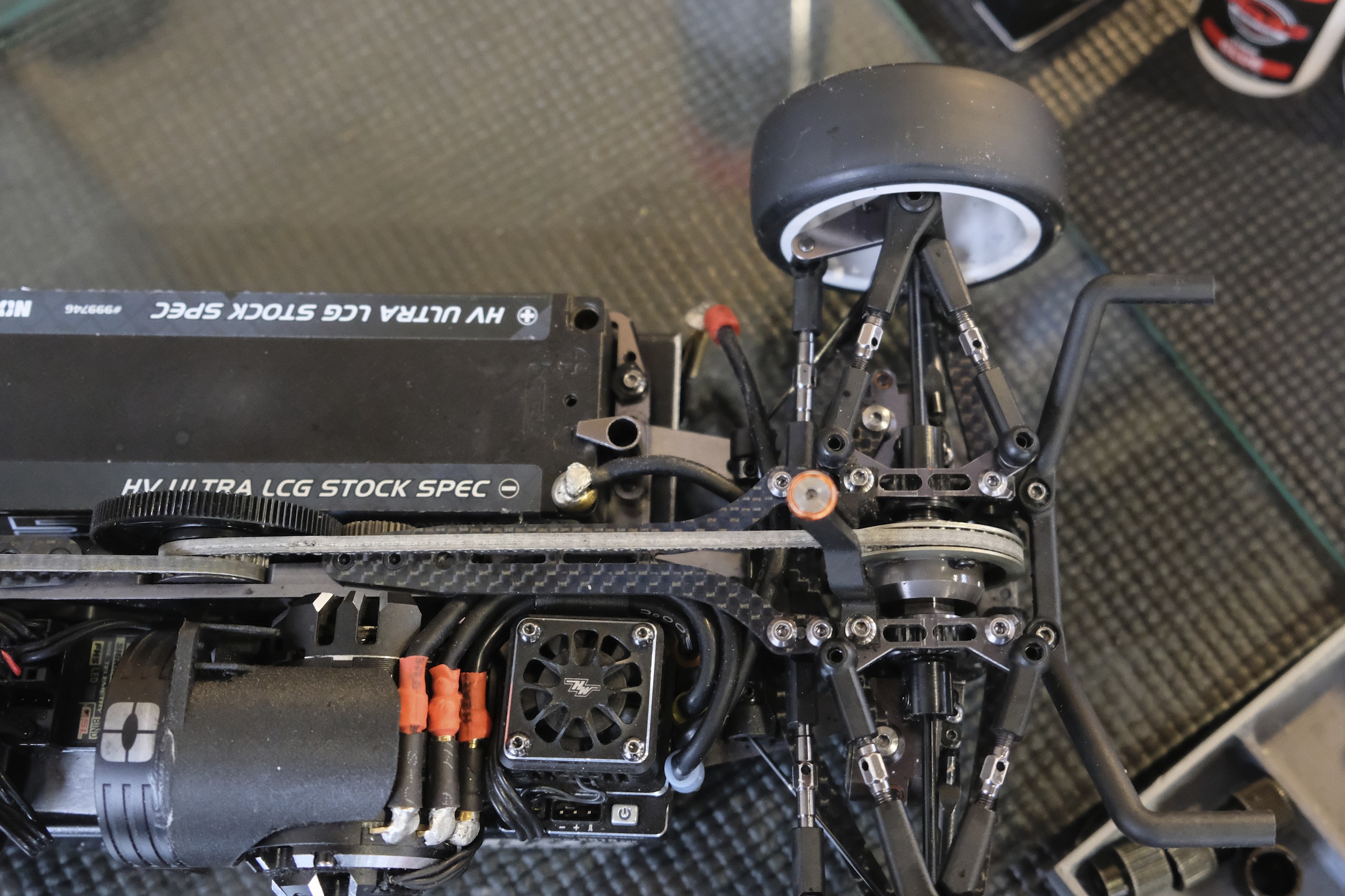 La Inf1nity IF14 Speciale de Raffaele Tolotta.Si ce tout nouveau modèle de Inf1nity a été présenté officiellement vers la mi-juillet 2025, cette seconde manche des IndoorSeries 2025-2026 est la première fois qu'il m'a été donné l'occasion de pouvoir en photographier deux. En effet, deux Inf1nity IF14 Speciale étaient présentes sur cette seconde manche des IndoorSeries 2025-2026. Une présentation plus détaillée de ces Inf1nity IF14 Speciale est disponible sur une page dédiée de ce site. La première auto, en version châssis aluminium flex, présentée en photos ci-dessous est celle de Raffaele Tolotta. Elle est équipée de plusieurs options, comme par exemple la poulie centrale "low friction" de 20 dents référence TS004LF et les poulies de spool et de différentiel"low friction" de 38 dents référence TS002LF, et de visserie en titane, probablement d'origine Hiro Seiko. |