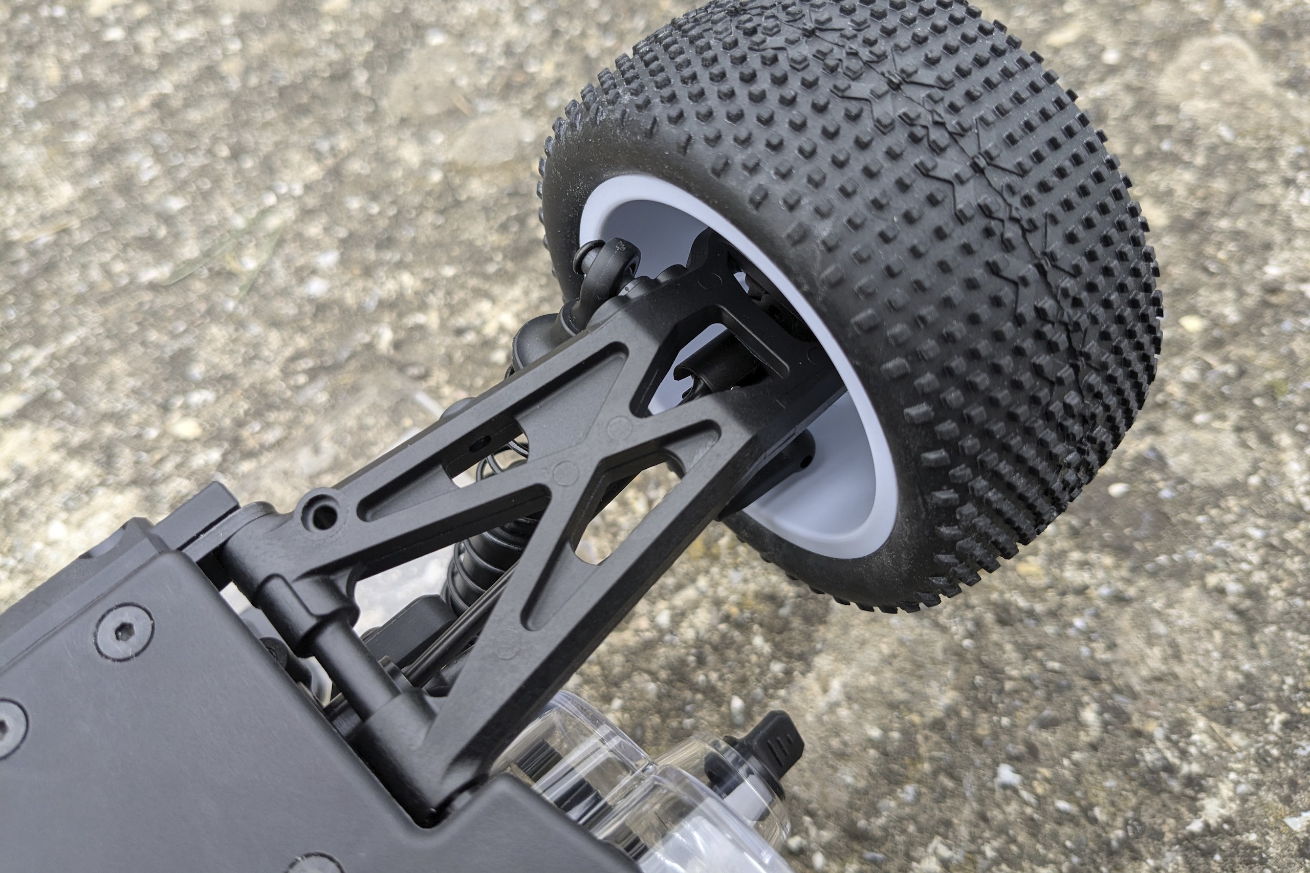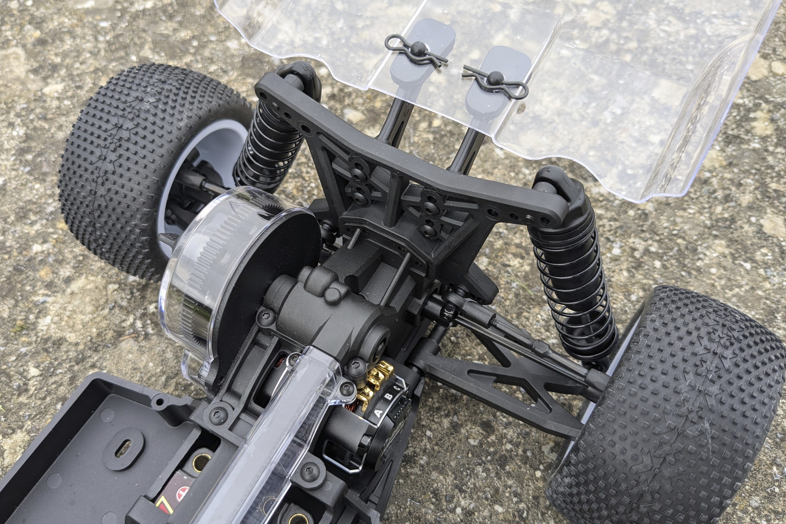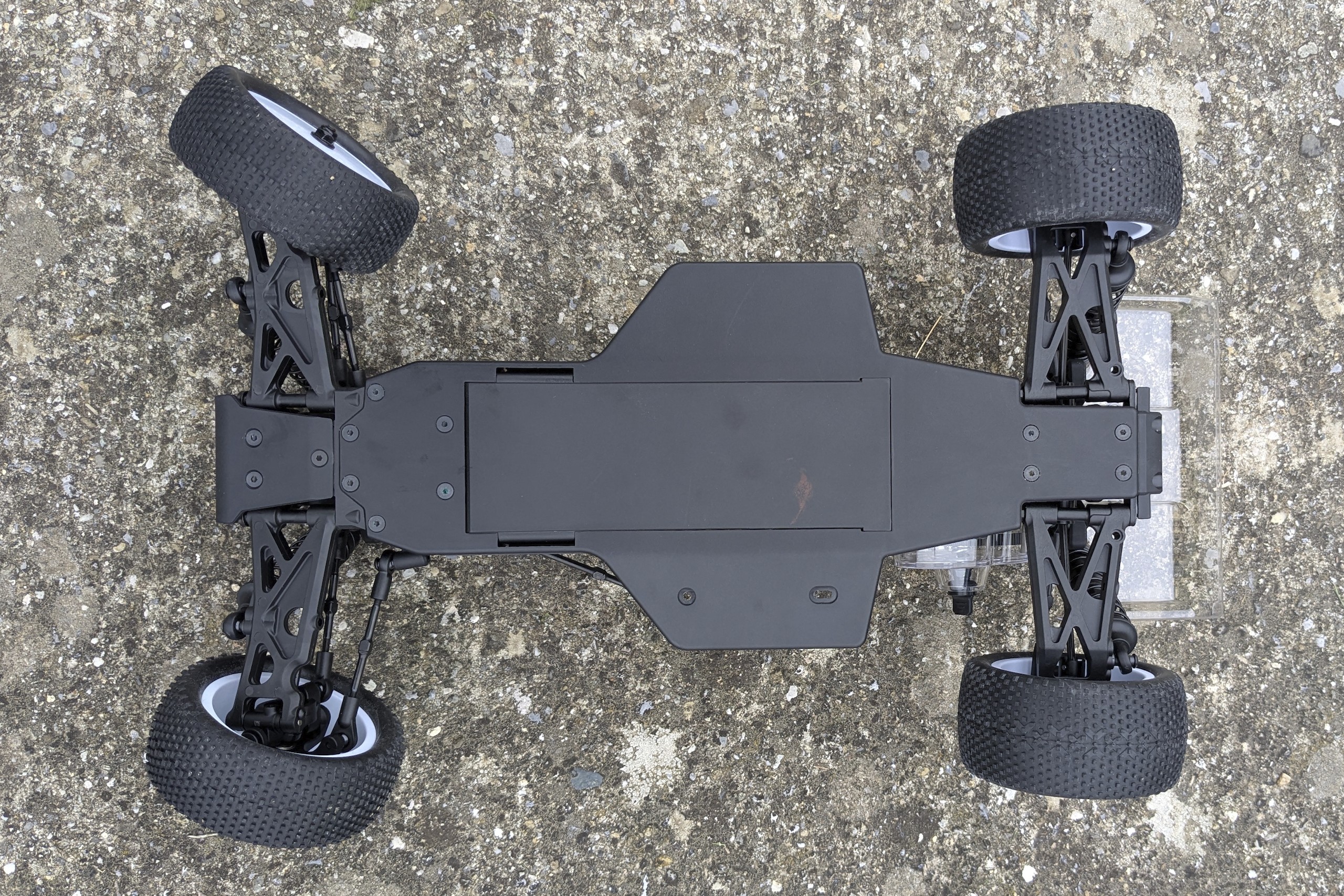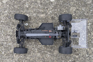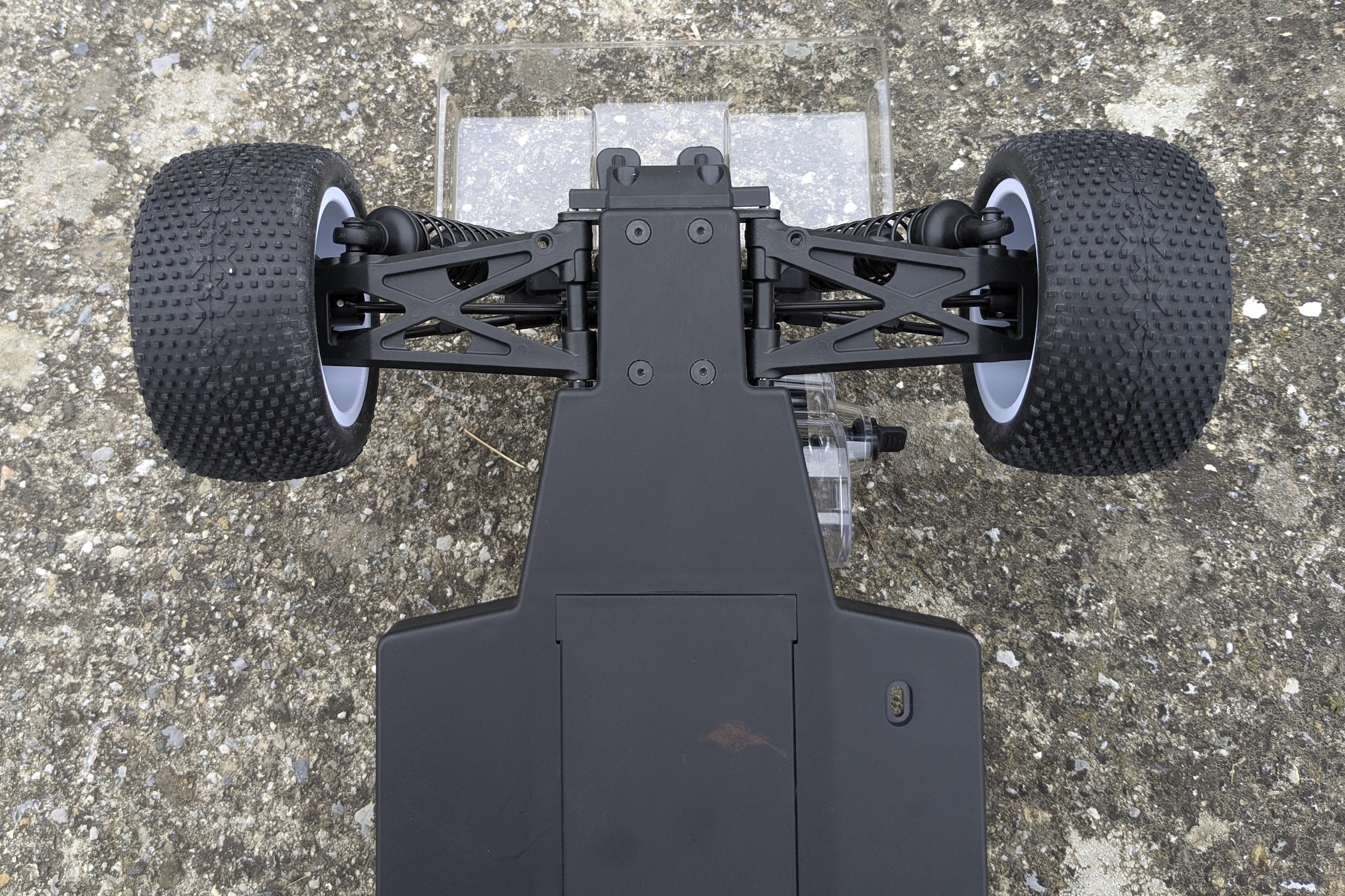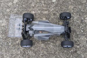 Les suspensions avant et arrière sont relativement classique avec de longs triangles inférieurs surmontés de biellettes à pas inversés (déjà prémontés à la bonne longueur!) associés à des amortisseurs hydrauliques de gros volume à émulsion (c'est-à-dire sans coupelle de volume constant) à corps en plastique. Le châssis est basé sur une grande pièce injectée en plastique permettant de loger la batterie en position longitudinale. La batterie s'insère par le dessous de l'auto grâce à un couvercle amovible pivotable et qui se vérrouille par deux clips et qui est de plus sécurisée par un loquet glissant. La transmission est à deux courroies, placées relativement au centre de l'auto, et à moteur en position centrale arrière, ce qui fait que, en raison du logement longitudinal de ladite batterie, que la couronne est placée relativement en hauteur, comme dans les années 90 justement, et que les courroies avant et arrière voient chacune leur chemin guidé sur leur brin inférieur par une poulie pour contourner ledit logement. Les jantes et les pneus sont de monte traditionnelle 2.2 pouces compatible avec la plupart des propositions du marché. L'auto comporte beaucoup de pièces en plastique, mais la plaque du support moteur est en alliage d'aluminium. L'ensemble respire la qualité, plus particulièrement au niveau de l'injection des pièces plastiques et de l'ajustement entre celles-ci, et démontre un grand soin dans la conception. Ici le focus a été fait sur la simplicité, la facilité d'entretien et d'utilisation et une certaine robustesse. Cela s'est fait au détriment du poids de l'auto qui semble assez lourde en comparaison d'autres autos du marché et d'une transmission relativement bruyante en raison de son carénage. Au final, cette proposition de G-Force est intrigante et séduisante. Elle ne s'adresse pas vraiment au marché généraliste du loisir, ni au marché de la haute compétition, mais par exemple à des débutants exigeants, à d'anciens pilotes qui ont eu déjà un Auto8 ou un AutoRCM dans les mains et qui veulent reprendre gentiment, à des "casual drivers" qui veulent participer à des compétitions locales à leur rythme avec un engin original, à des adeptes de Vintage qui veulent rouler "Old-School" en prenant plus de risques qu'avec une ancienne auto. Bref, le Xtrada n'est pas vraiment un produit mainstream, mais pourrait répondre à bon nombre de besoin de niches. Pas encore de retour du comportement sur la piste de ce G-Force XStrada, mais les bons ingrédients semblent déjà être réunis pour un résultat sympathique. |