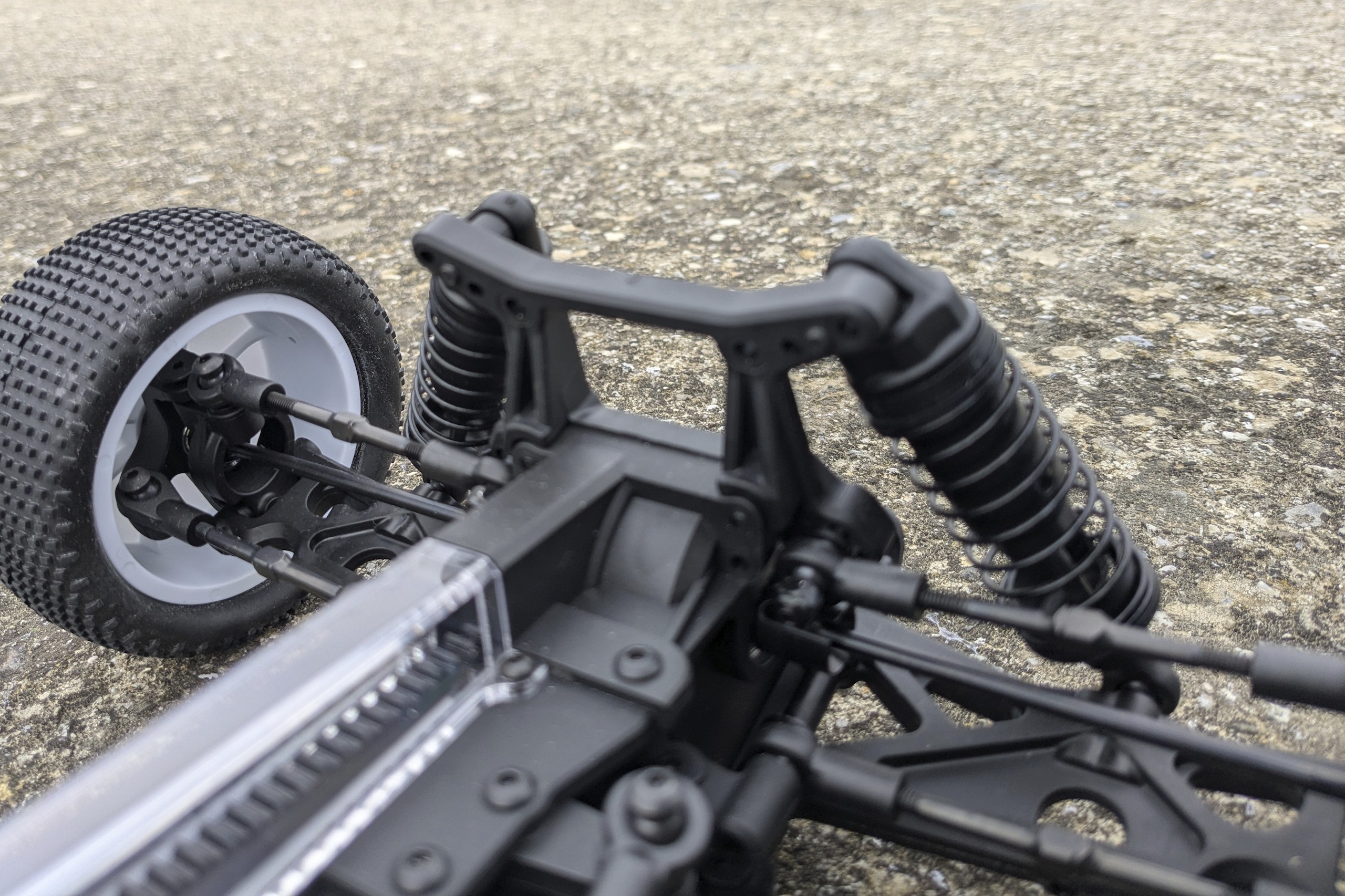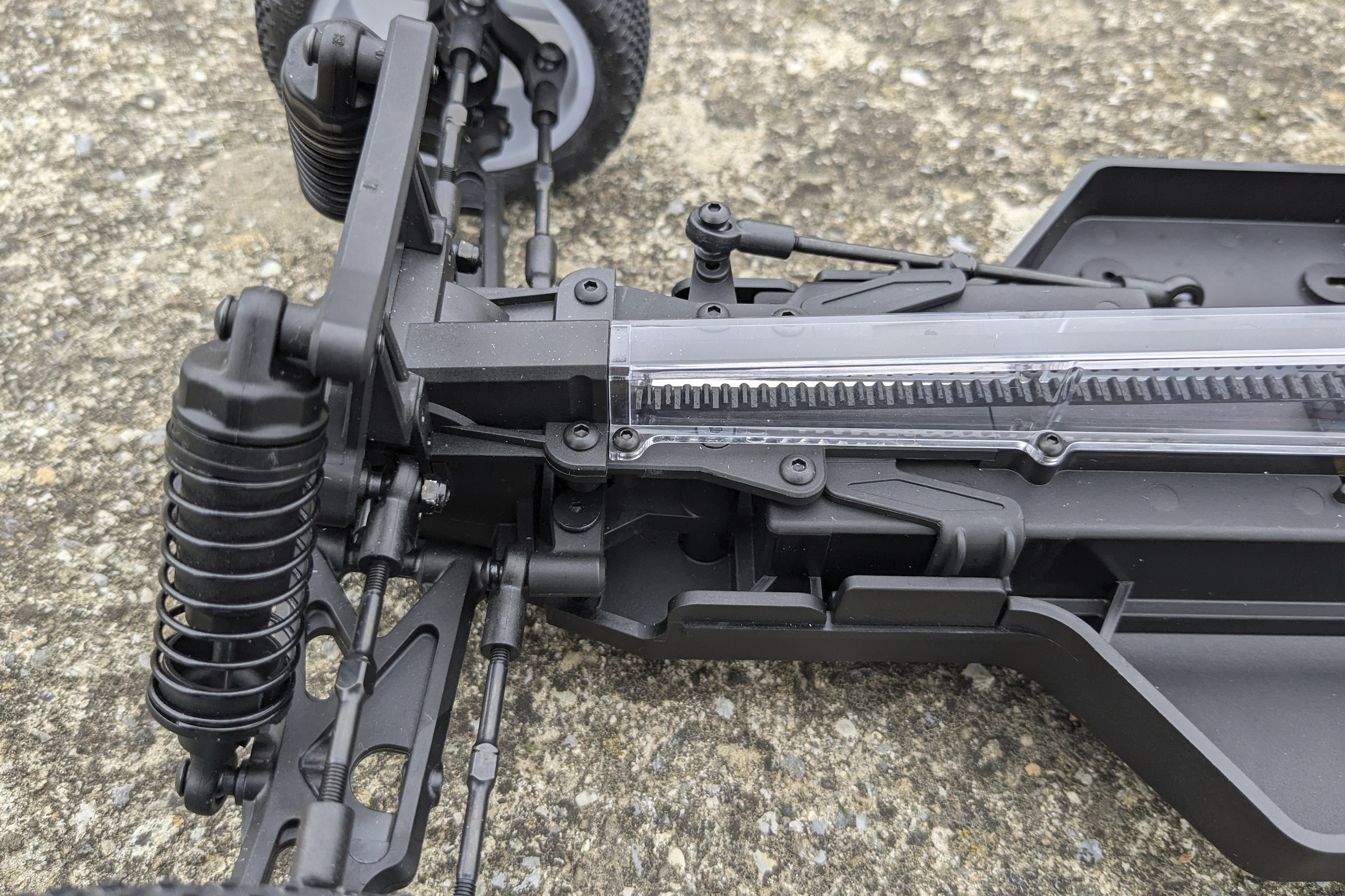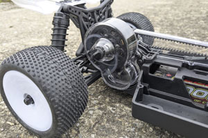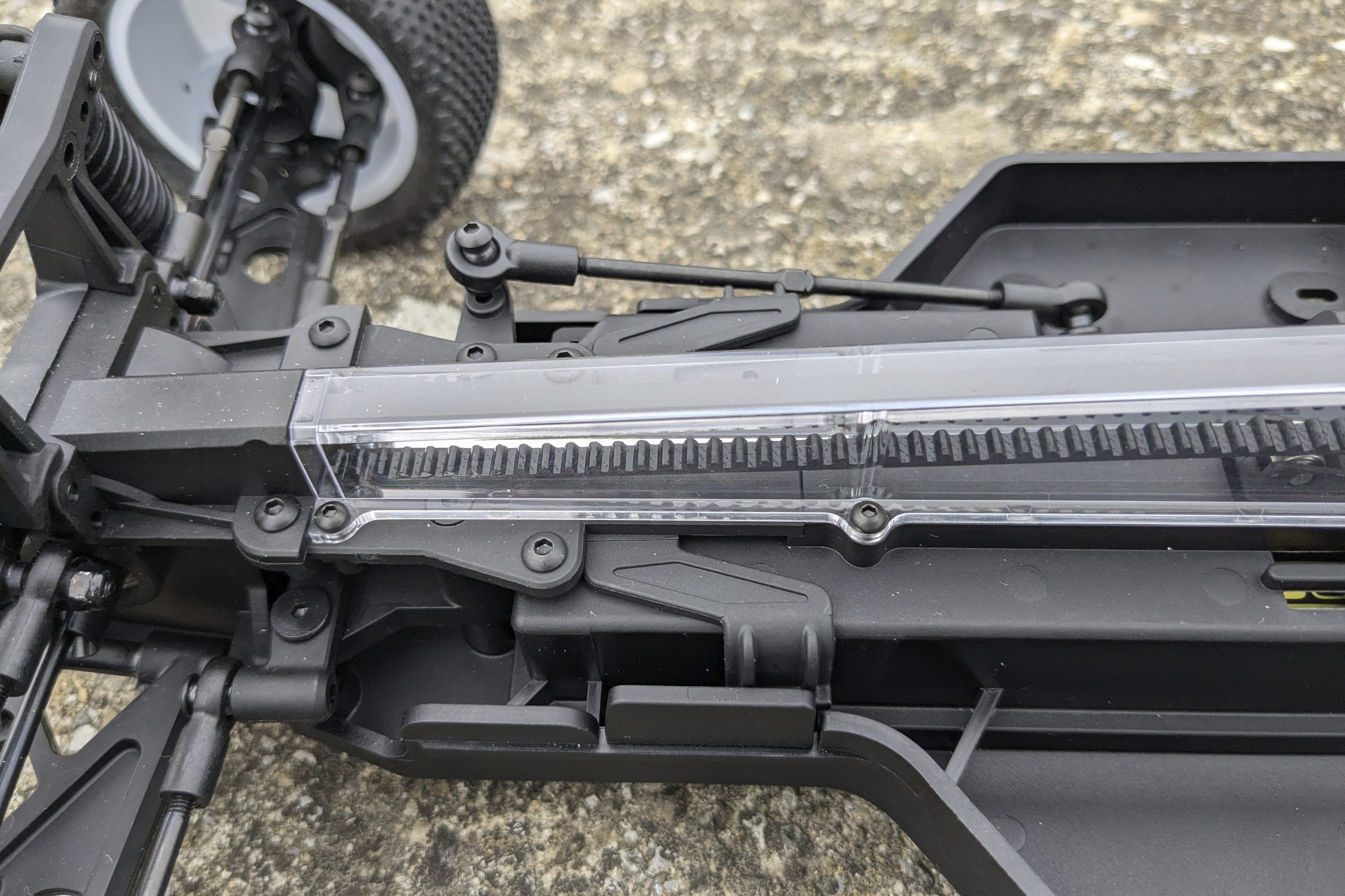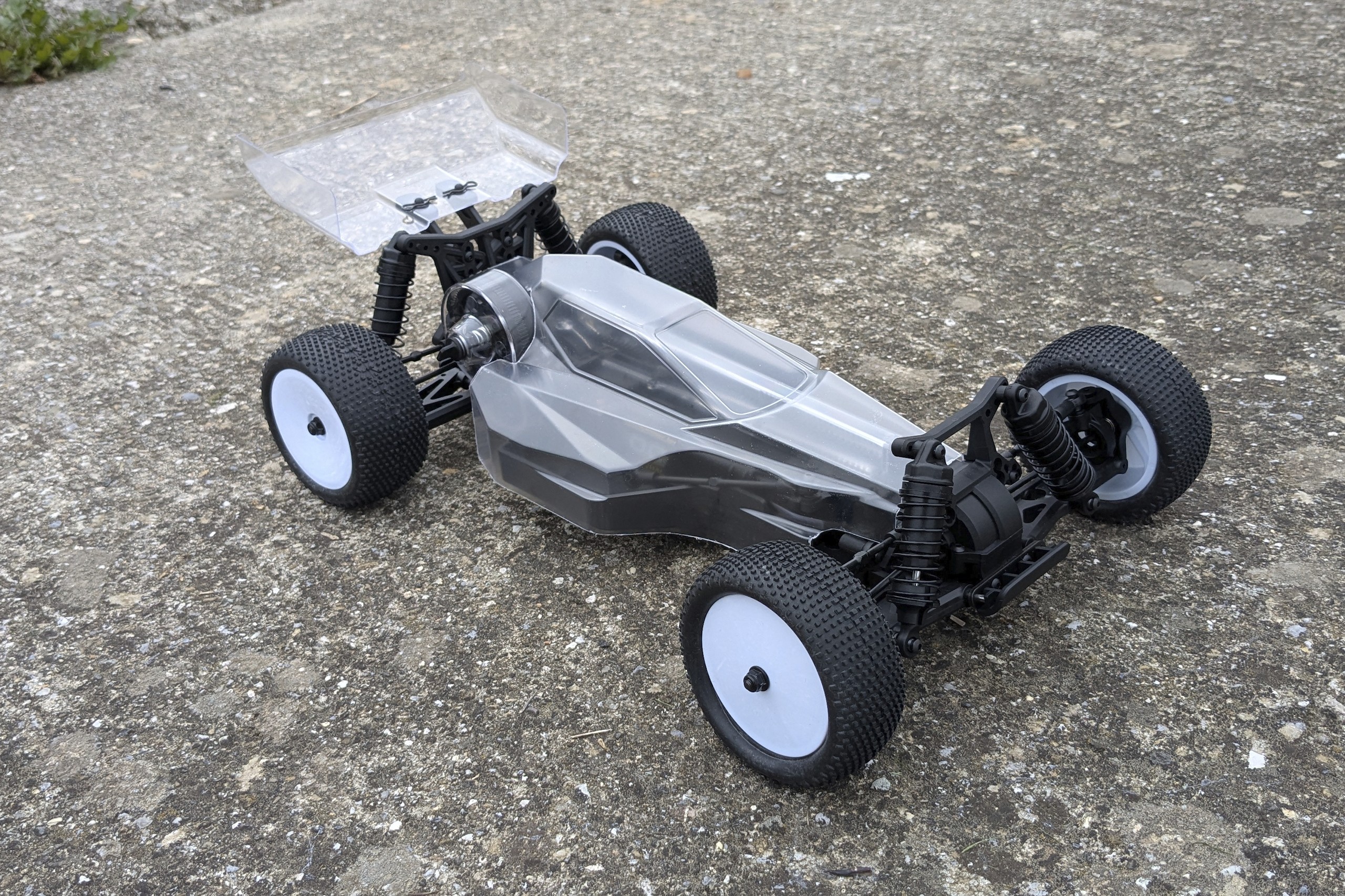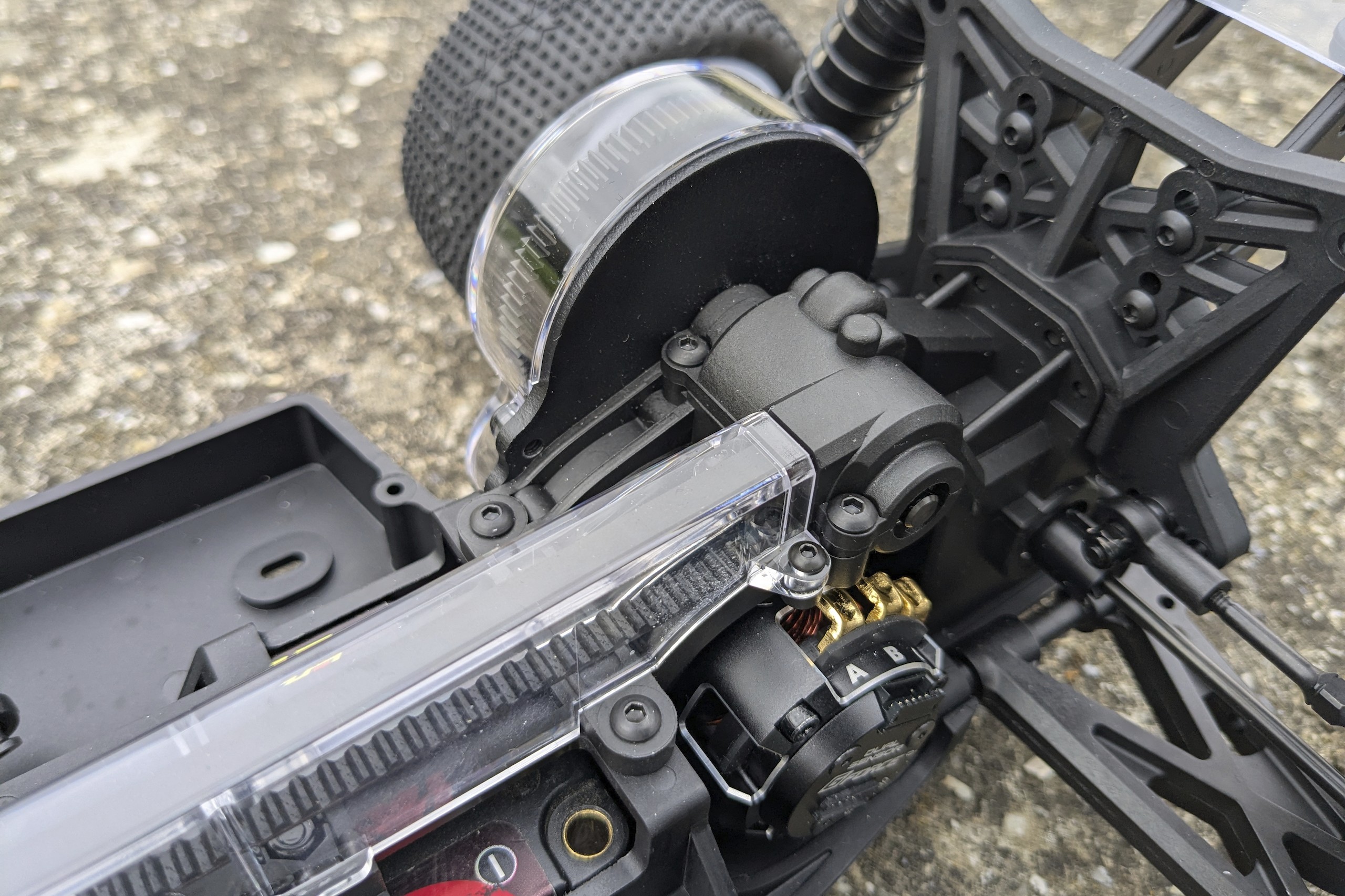 Les suspensions avant et arrière sont relativement classique avec de longs triangles inférieurs surmontés de biellettes à pas inversés (déjà prémontés à la bonne longueur!) associés à des amortisseurs hydrauliques de gros volume à émulsion (c'est-à-dire sans coupelle de volume constant) à corps en plastique. Le châssis est basé sur une grande pièce injectée en plastique permettant de loger la batterie en position longitudinale. La batterie s'insère par le dessous de l'auto grâce à un couvercle amovible pivotable et qui se vérrouille par deux clips et qui est de plus sécurisée par un loquet glissant. La transmission est à deux courroies, placées relativement au centre de l'auto, et à moteur en position centrale arrière, ce qui fait que, en raison du logement longitudinal de ladite batterie, que la couronne est placée relativement en hauteur, comme dans les années 90 justement, et que les courroies avant et arrière voient chacune leur chemin guidé sur leur brin inférieur par une poulie pour contourner ledit logement. Les jantes et les pneus sont de monte traditionnelle 2.2 pouces compatible avec la plupart des propositions du marché. L'auto comporte beaucoup de pièces en plastique, mais la plaque du support moteur est en alliage d'aluminium. L'ensemble respire la qualité, plus particulièrement au niveau de l'injection des pièces plastiques et de l'ajustement entre celles-ci, et démontre un grand soin dans la conception. Ici le focus a été fait sur la simplicité, la facilité d'entretien et d'utilisation et une certaine robustesse. Cela s'est fait au détriment du poids de l'auto qui semble assez lourde en comparaison d'autres autos du marché et d'une transmission relativement bruyante en raison de son carénage. Au final, cette proposition de G-Force est intrigante et séduisante. Elle ne s'adresse pas vraiment au marché généraliste du loisir, ni au marché de la haute compétition, mais par exemple à des débutants exigeants, à d'anciens pilotes qui ont eu déjà un Auto8 ou un AutoRCM dans les mains et qui veulent reprendre gentiment, à des "casual drivers" qui veulent participer à des compétitions locales à leur rythme avec un engin original, à des adeptes de Vintage qui veulent rouler "Old-School" en prenant plus de risques qu'avec une ancienne auto. Bref, le Xtrada n'est pas vraiment un produit mainstream, mais pourrait répondre à bon nombre de besoin de niches. Pas encore de retour du comportement sur la piste de ce G-Force XStrada, mais les bons ingrédients semblent déjà être réunis pour un résultat sympathique. |