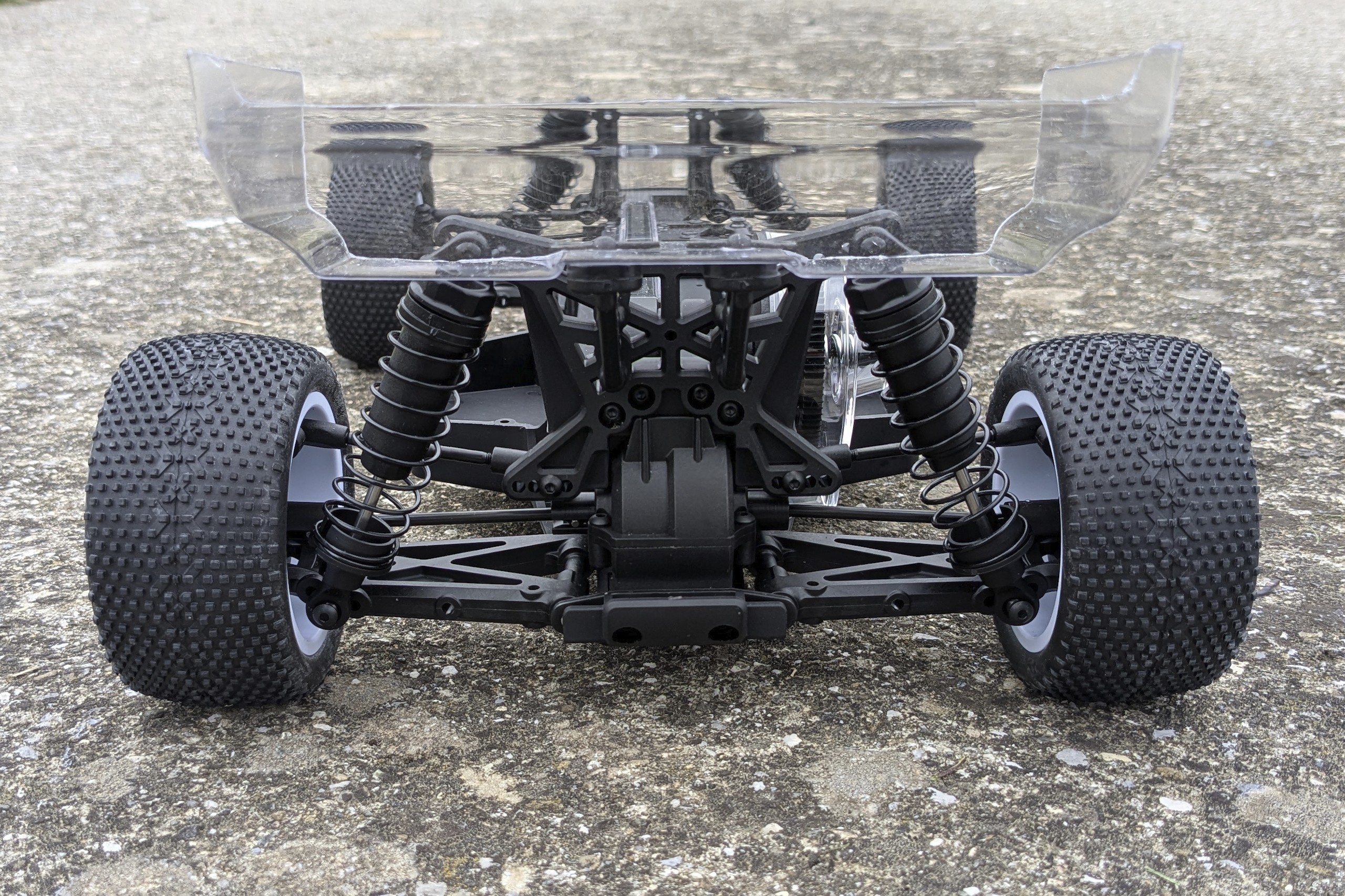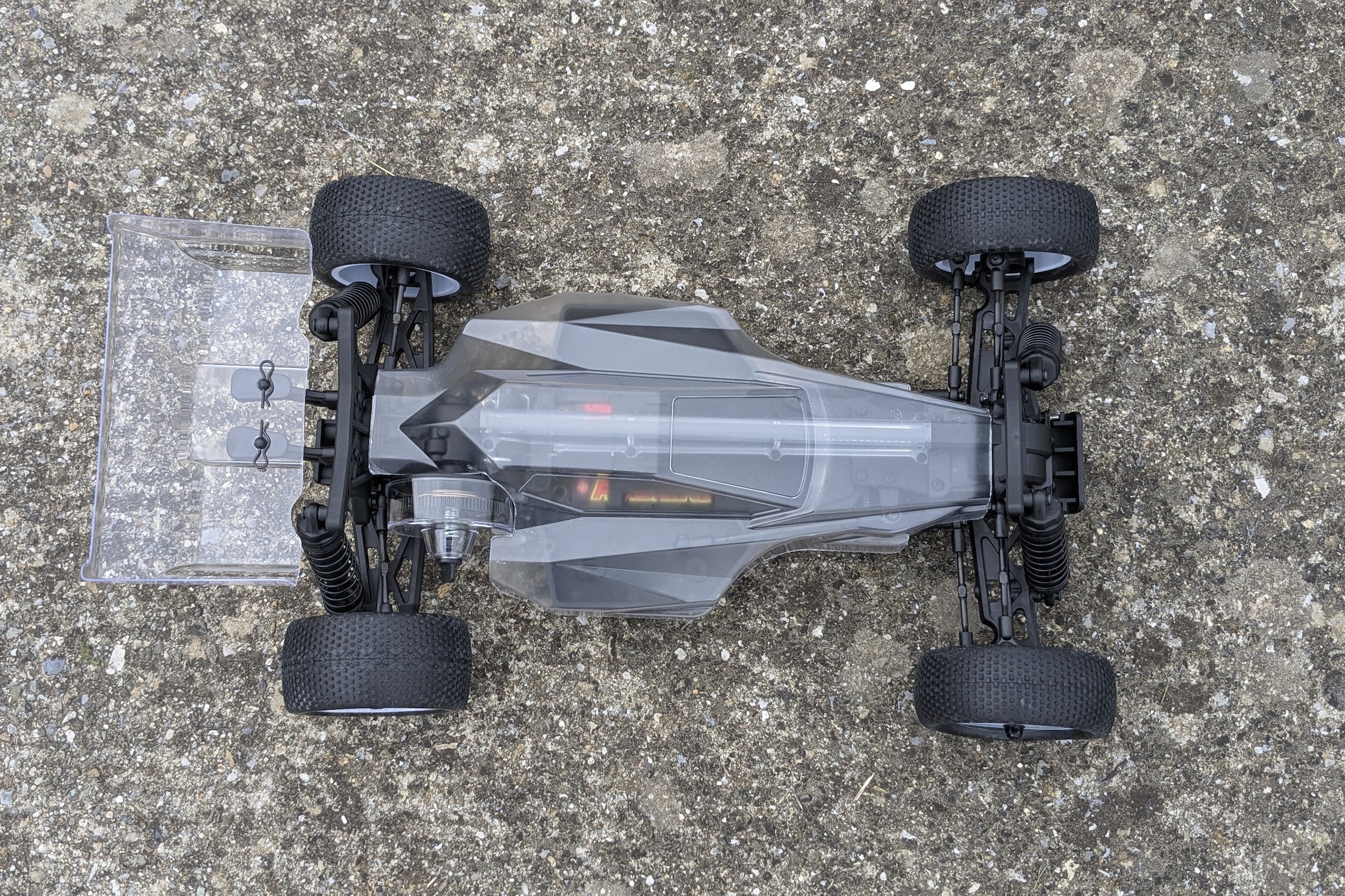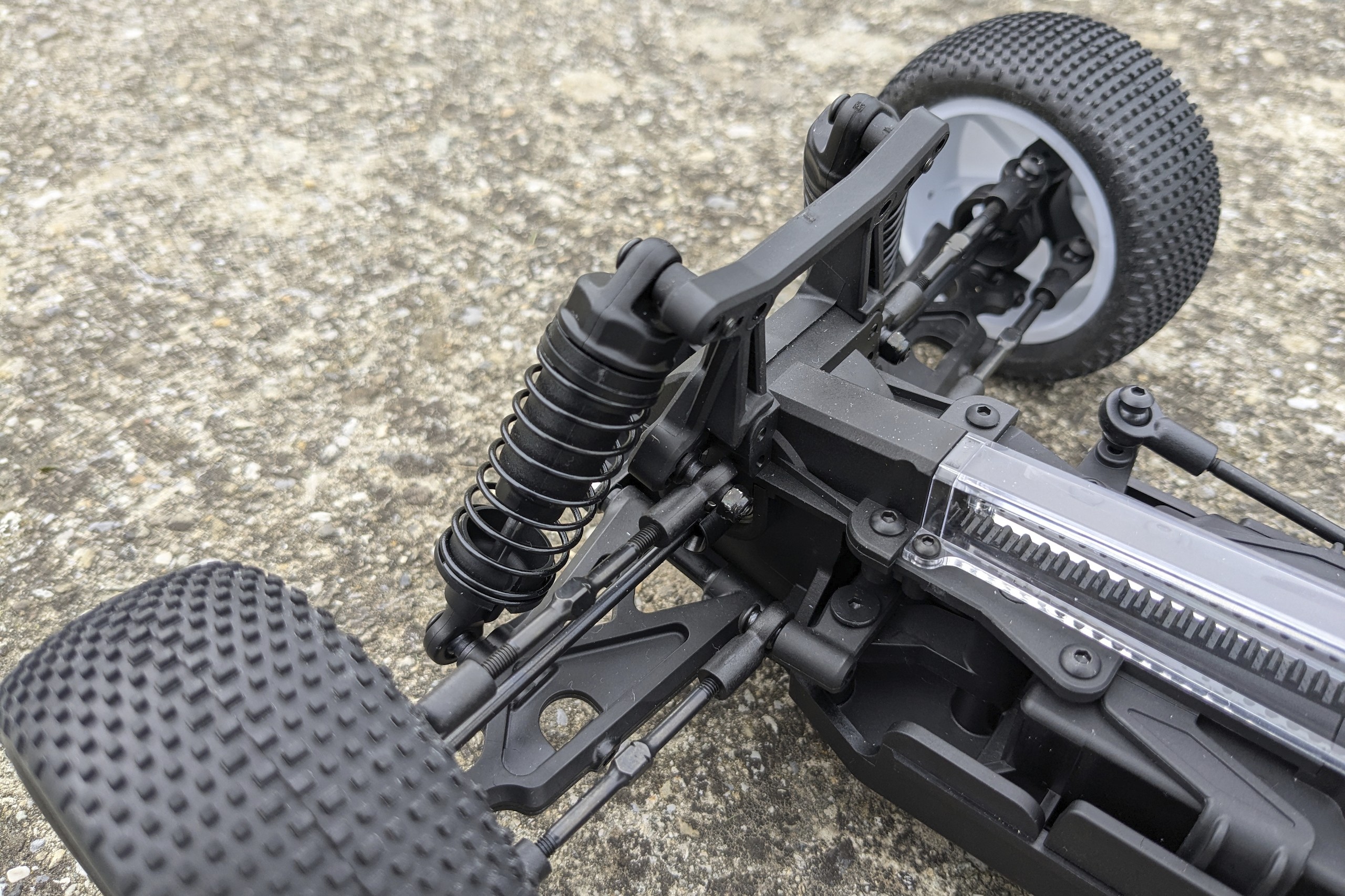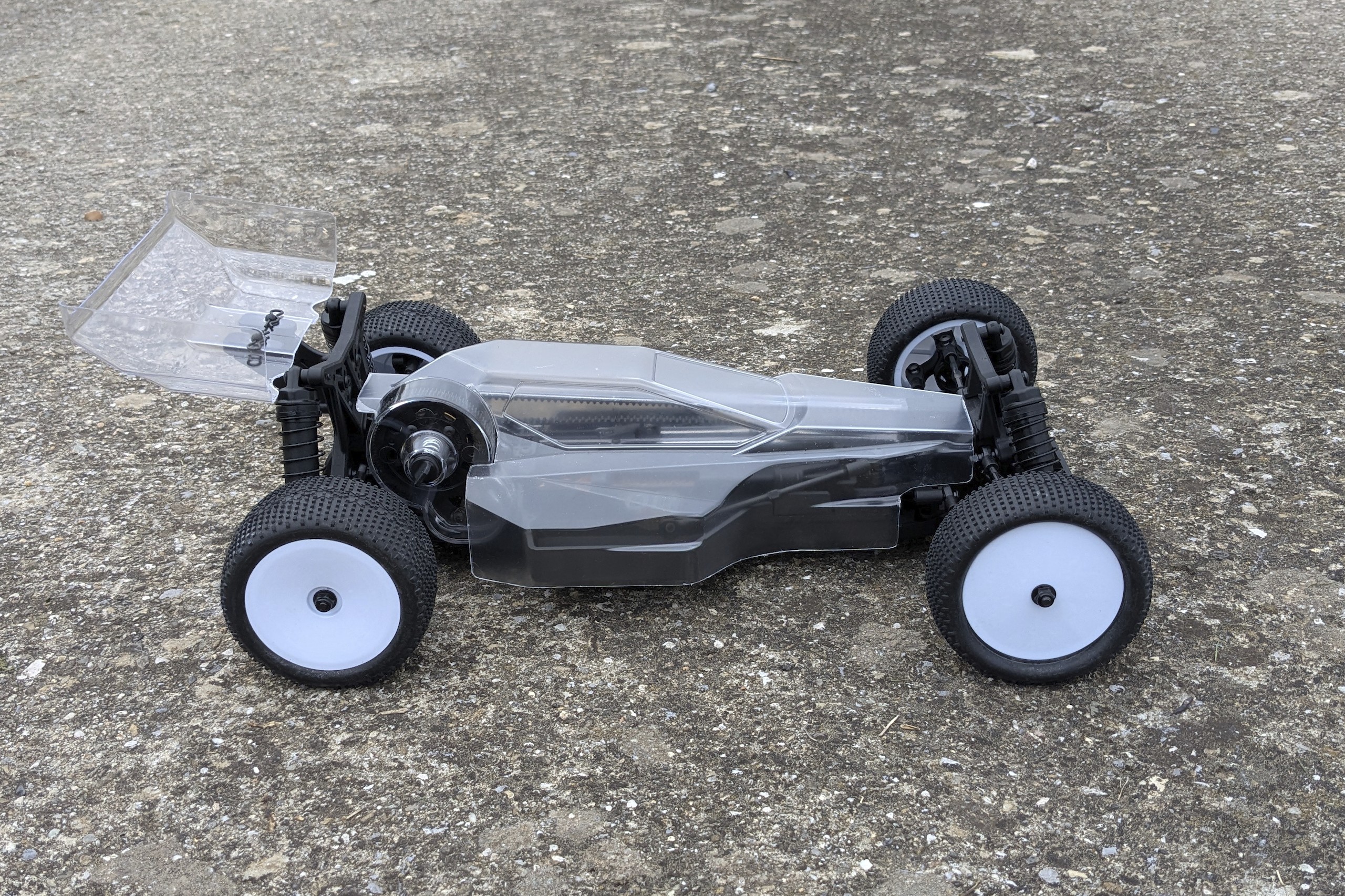 Les suspensions avant et arrière sont relativement classique avec de longs triangles inférieurs surmontés de biellettes à pas inversés (déjà prémontés à la bonne longueur!) associés à des amortisseurs hydrauliques de gros volume à émulsion (c'est-à-dire sans coupelle de volume constant) à corps en plastique. Le châssis est basé sur une grande pièce injectée en plastique permettant de loger la batterie en position longitudinale. La batterie s'insère par le dessous de l'auto grâce à un couvercle amovible pivotable et qui se vérrouille par deux clips et qui est de plus sécurisée par un loquet glissant. La transmission est à deux courroies, placées relativement au centre de l'auto, et à moteur en position centrale arrière, ce qui fait que, en raison du logement longitudinal de ladite batterie, que la couronne est placée relativement en hauteur, comme dans les années 90 justement, et que les courroies avant et arrière voient chacune leur chemin guidé sur leur brin inférieur par une poulie pour contourner ledit logement. Les jantes et les pneus sont de monte traditionnelle 2.2 pouces compatible avec la plupart des propositions du marché. L'auto comporte beaucoup de pièces en plastique, mais la plaque du support moteur est en alliage d'aluminium. L'ensemble respire la qualité, plus particulièrement au niveau de l'injection des pièces plastiques et de l'ajustement entre celles-ci, et démontre un grand soin dans la conception. Ici le focus a été fait sur la simplicité, la facilité d'entretien et d'utilisation et une certaine robustesse. Cela s'est fait au détriment du poids de l'auto qui semble assez lourde en comparaison d'autres autos du marché et d'une transmission relativement bruyante en raison de son carénage. Au final, cette proposition de G-Force est intrigante et séduisante. Elle ne s'adresse pas vraiment au marché généraliste du loisir, ni au marché de la haute compétition, mais par exemple à des débutants exigeants, à d'anciens pilotes qui ont eu déjà un Auto8 ou un AutoRCM dans les mains et qui veulent reprendre gentiment, à des "casual drivers" qui veulent participer à des compétitions locales à leur rythme avec un engin original, à des adeptes de Vintage qui veulent rouler "Old-School" en prenant plus de risques qu'avec une ancienne auto. Bref, le Xtrada n'est pas vraiment un produit mainstream, mais pourrait répondre à bon nombre de besoin de niches. Pas encore de retour du comportement sur la piste de ce G-Force XStrada, mais les bons ingrédients semblent déjà être réunis pour un résultat sympathique. |