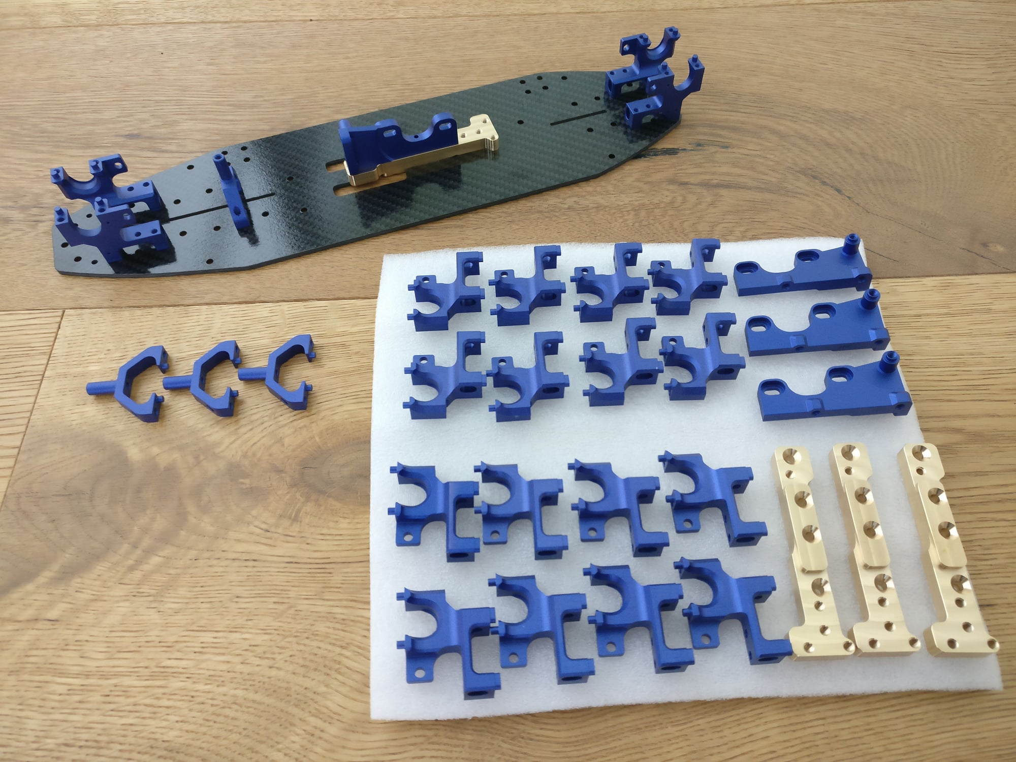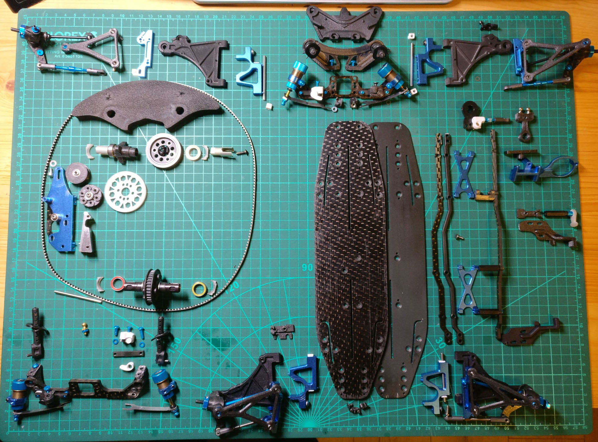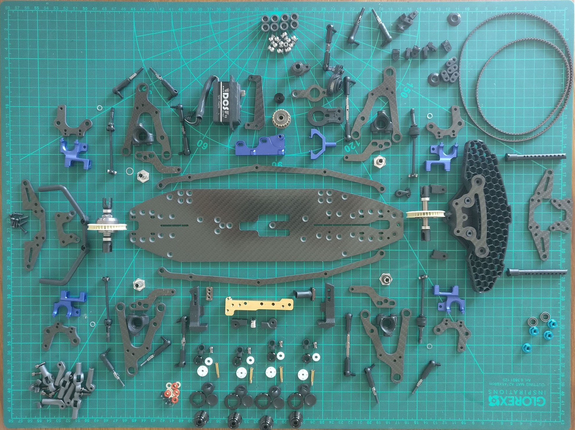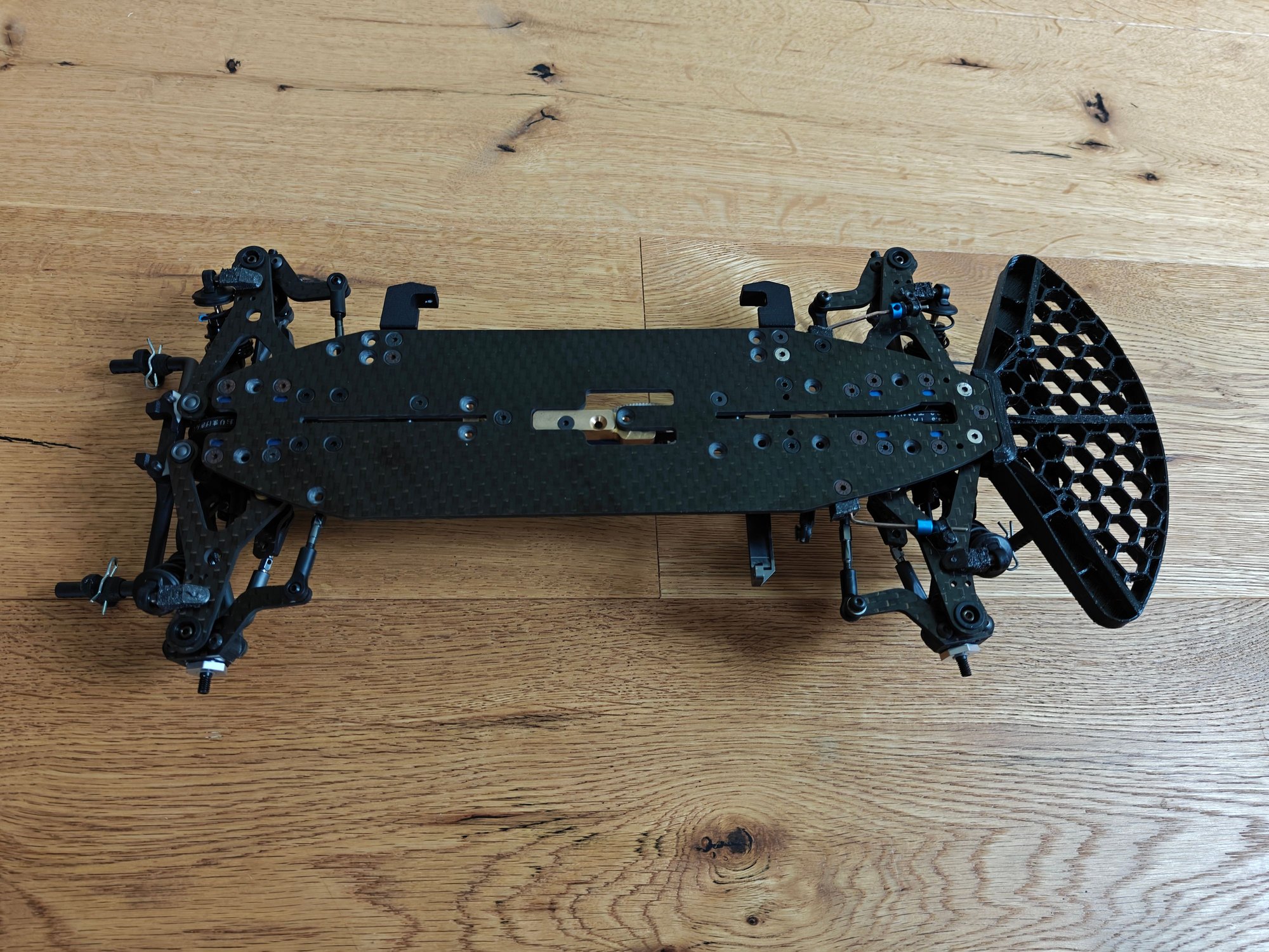 P1: Chassis.Viele Bilder auf RedRC, RCTech, etc. haben gezeigt, dass viele Chassis auf Asphalt stark abnutzen - weil die Platten relativ gross waren. Das Chassis soll kurze Überhänge haben, vor allem hinten. Das sollte über überhängende Bulkheads erreicht werden. Anstatt die Hinge Pins über separate Teile aufzuhängen, wie bei Xray T4, sollte der Bulkhead die Pins direkt aufnehmen. |