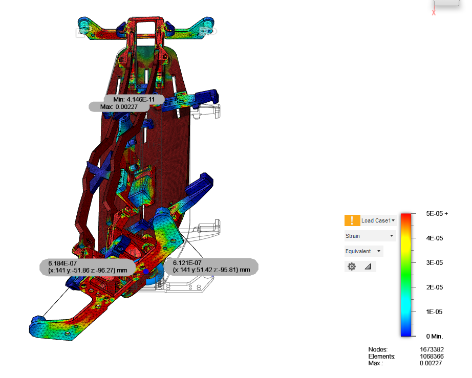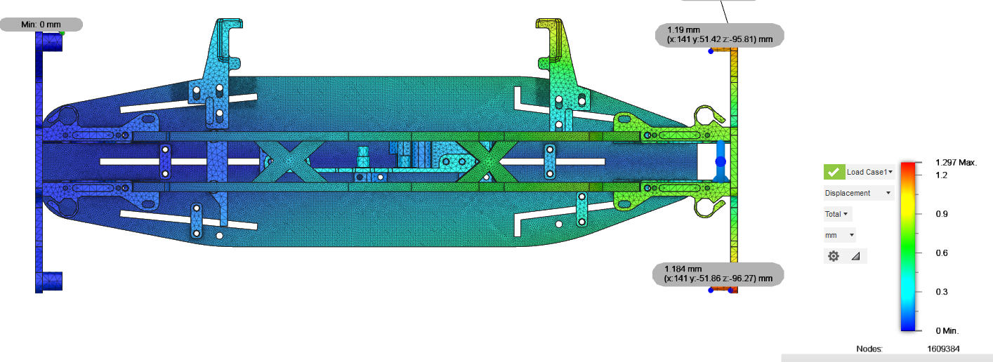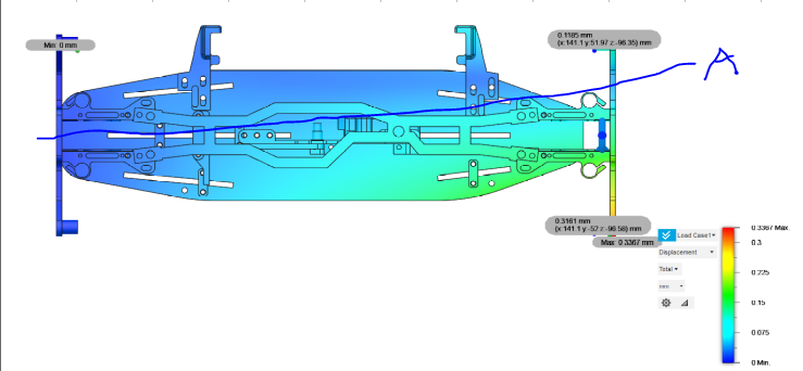Das Chassis soll einen grossen Verstellbereich für den Chassisflex haben, da dies ein wichtiger Tuningparameter ist. Für das h2e five Chassiskonzept wurden verschiedene Topdecks mit Finiten Elementen simuliert, und es kam heraus, dass das vertikale Topdeck eine grössere Spanne von Steifigkeiten abdecken kann - wenn auch mit mehr Gewicht. Horizontale Topdecks - auch geteilte wie beim A800MMX - hatten keine torsionsweiche Chassis ergeben. |