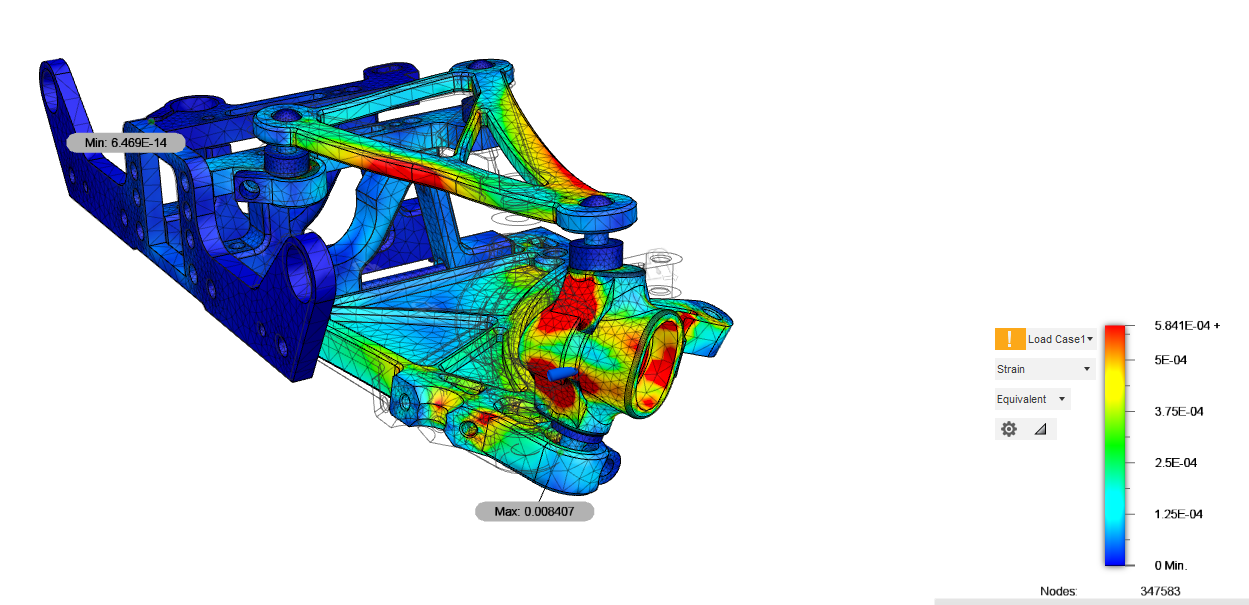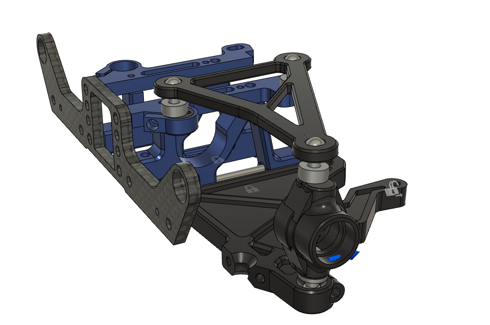 P7: Robustheit erhöhen.Die oberen Aufhängungen sollen normale Kugelpfannen und Turnbuckles haben für gute Verstellbarkeit und insgesamt einen niedrigeren Schwerpunkt als beim h2e five. Die Kingpin Inclination soll beibehalten werden, und ein eigener Radträger designt werden. Die untere Kugelpfanne war beim h2e five Radträger oft gebrochen, weswegen das Design mit den zwei Schrauben unten erfunden wurde. Damit sind die Teile auch günstig und Design-Updates gut möglich (z.B. verschiedene KPI Winkel). |