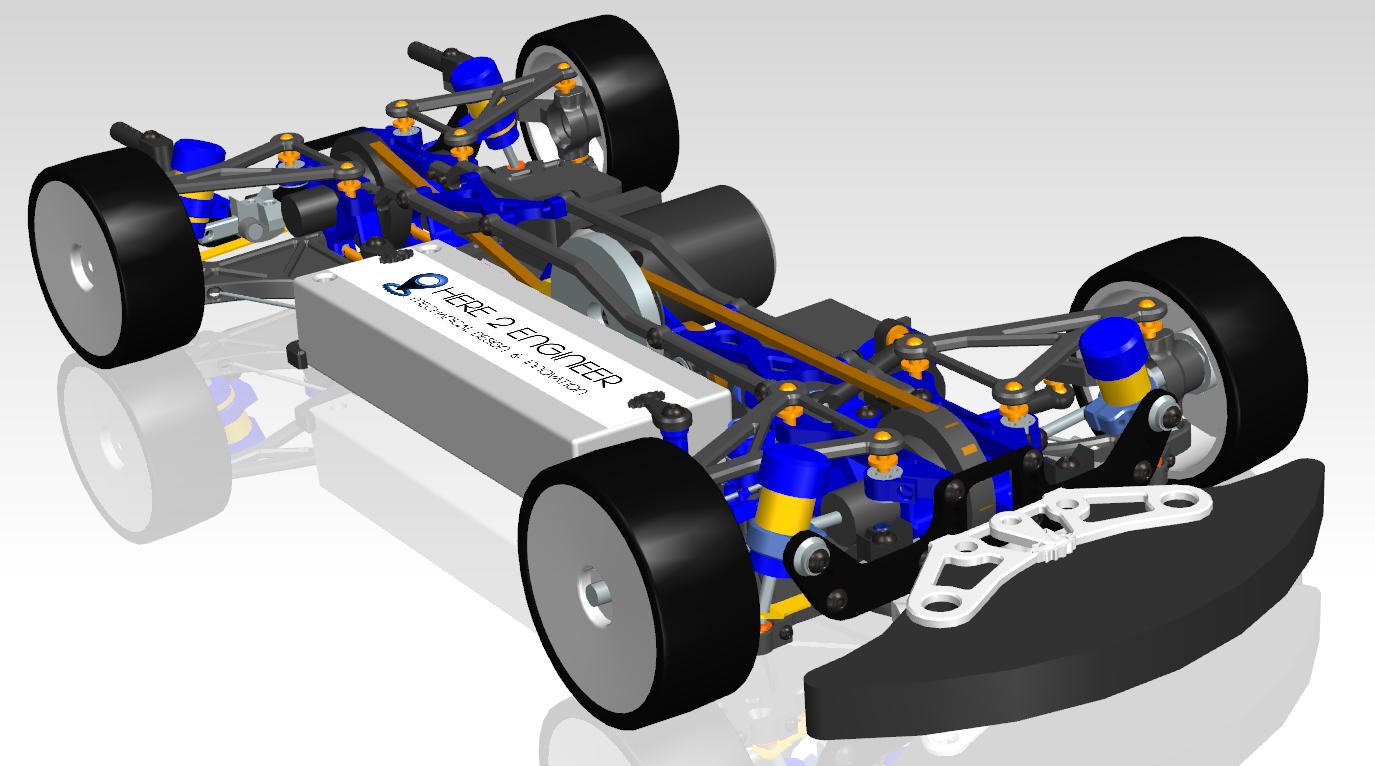 P1: Châssis.De nombreuses photos sur RedRC, RCTech, etc. montrent que beaucoup de châssis s'usent fortement sur l'asphalte, parce qu'ils sont sont relativement longs. Le châssis aura des porte-à-faux courts, surtout à l'arrière. Cela devrait être réalisé via des paliers de cellule en surplomb. Au lieu de suspendre les axes d'articulation via des pièces séparées, comme par exemple sur la Team Xray T4, les paliers de cellule supporteront directement les axes. |