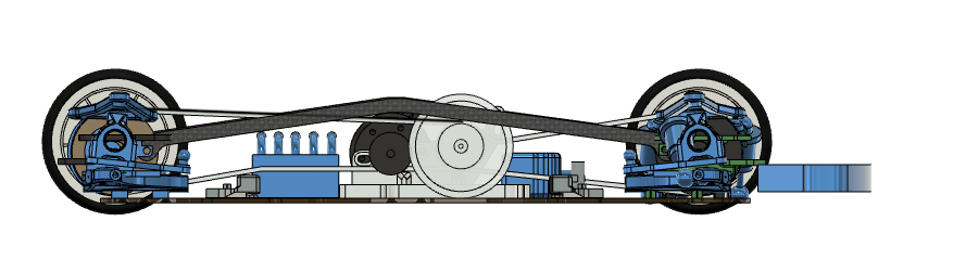 P9: Inertie autour de l'axe de lacet.Dans une feuille Excel, différentes combinaisons de courroies disponibles ont été testées, de sorte à déterminer quelle variante a la plus faible inertie autour de l'axe de lacet. Le résultat m'a surpris, car les différences étaient assez importantes. Il y avait le potentiel d'imiter l'agilité de l'électronique avec une batterie au format Shorty, mais avec une batterie Stick normal, donc le meilleur des deux mondes! Comme le châssis devait aussi être bon pour le Stock, il a été designé pour une batterie au format Stick LCG. Les caractéristiques de design qui servent l'objectif d'une faible inertie sont :