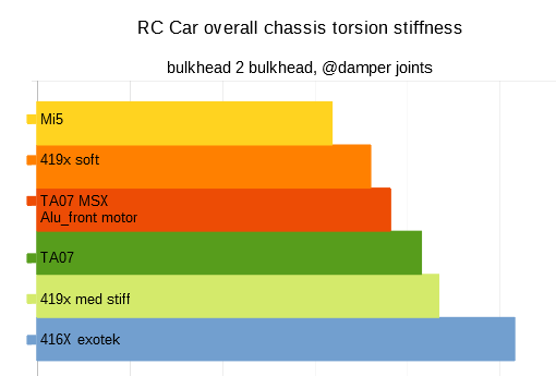 P3: Le flex du châssis est un paramètre de réglage important, mais n'est pas vraiment quantifiée.Avant de démarrer le design de mon propre châssis, la rigidité en torsion de différents modèles a été mesurée avec un dispositif: de la Schumacher Mi5 souple à la TRF416X rigide. |