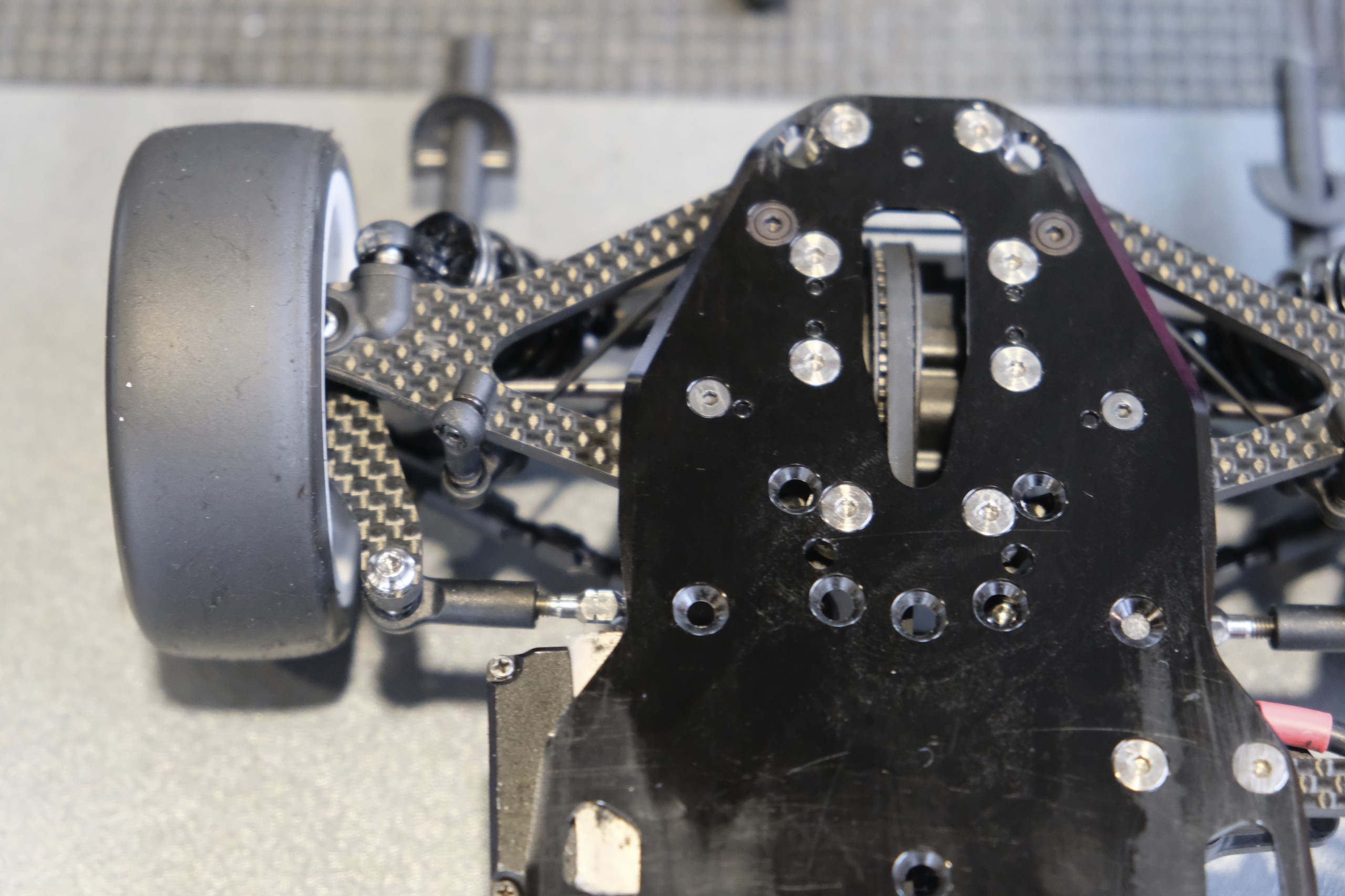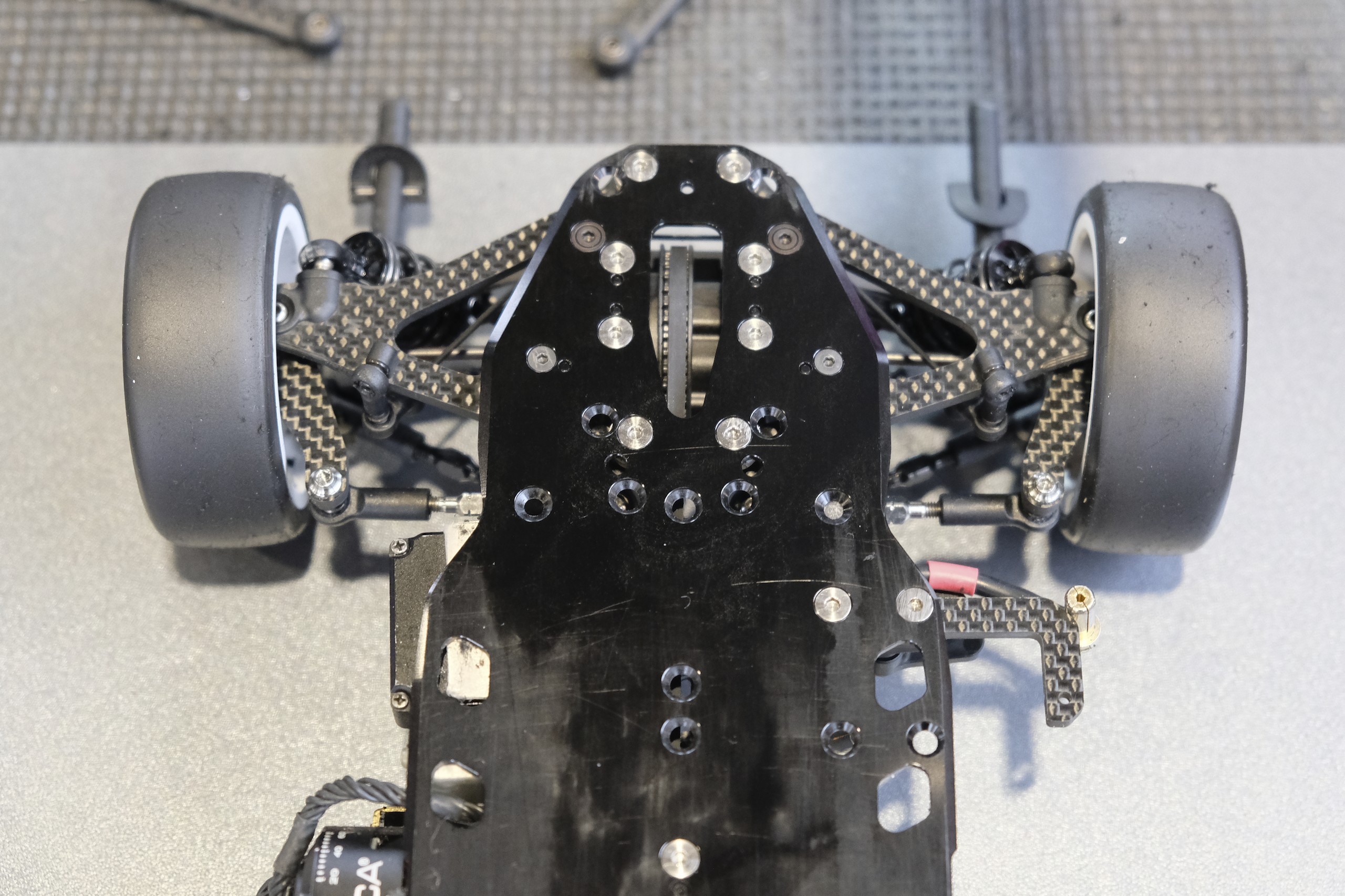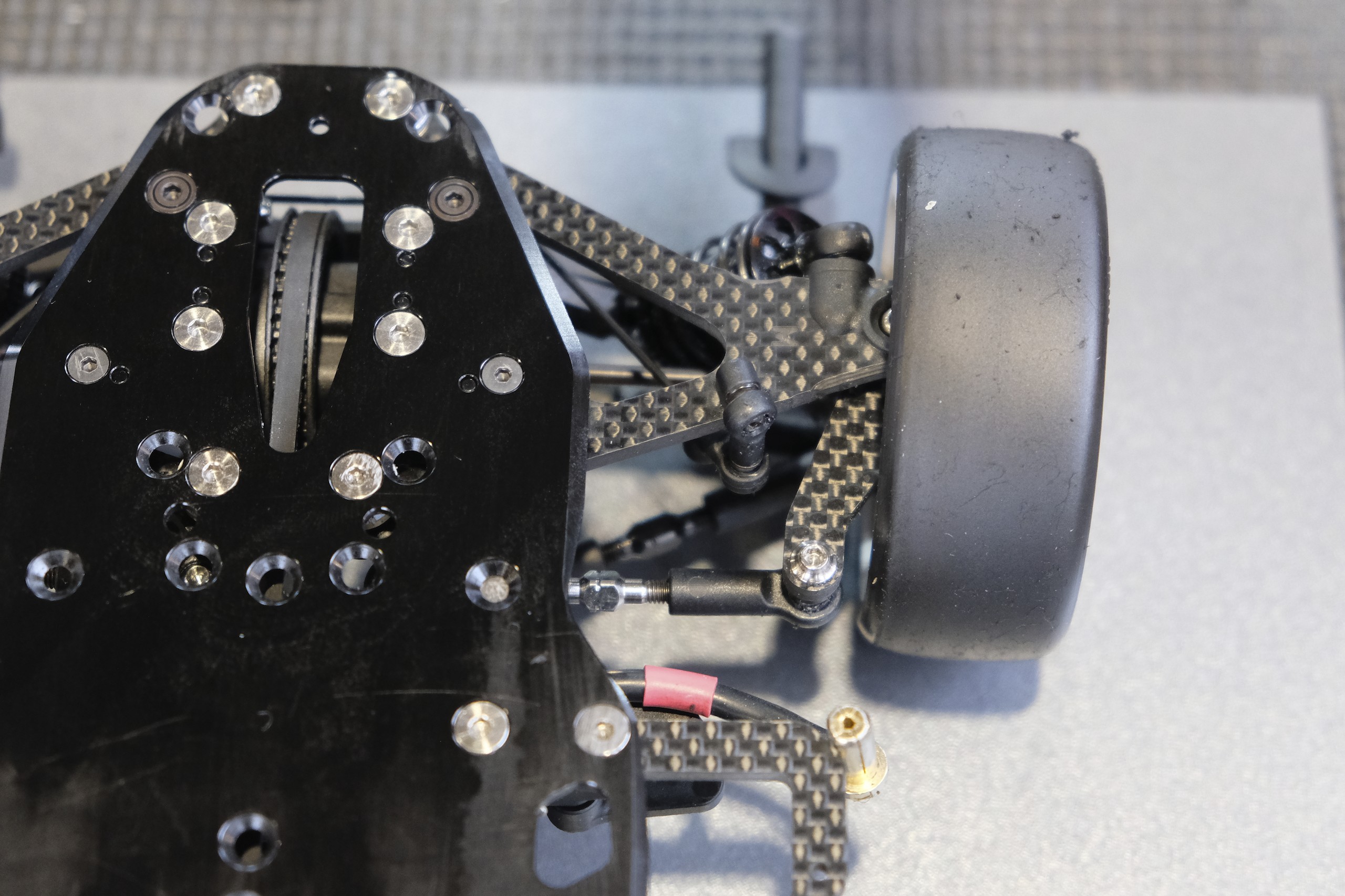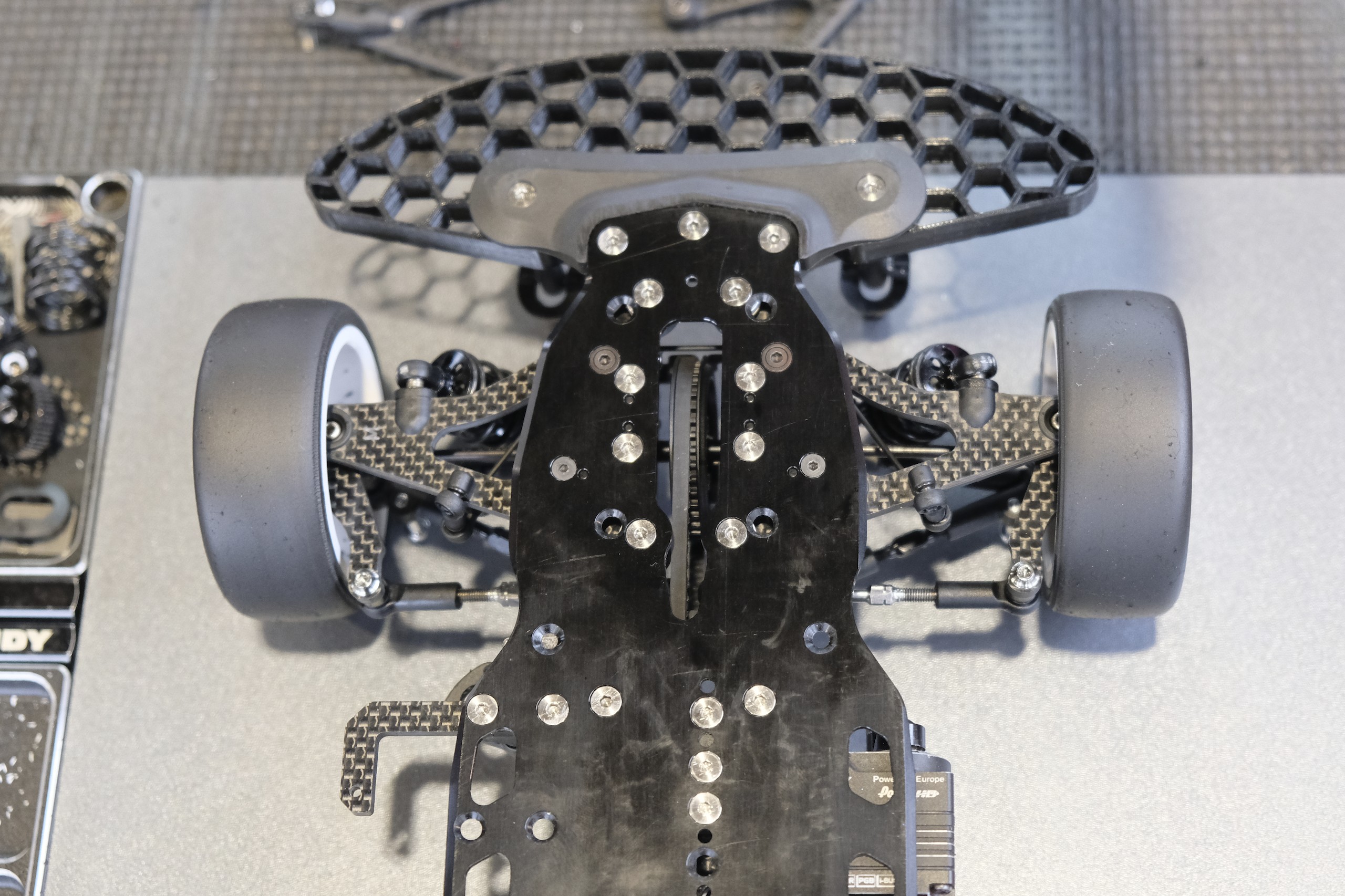 Comme écrit précédemment, exit les mortisseurs ancrés à l'intérieur des triangles, mais exit aussi les triangles inférieurs "CFF" (pour "Carbon Fiber Fusion", qui est la désignation de Team XRay pour ses triangles inférieurs et supérieurs comprenant une âme découpée dans une plaque de composite à base de fibres de carbone sur laquelle est surmoulée une structure comprenant les chapes de rotules de suspension et les supports de barre antiroulis), et place aux nouveaux triangles "CFF2". Ces derniers reposent également sur le principe du surmoulage des éléments en plastique sur du carbone, mais cette fois-ci, le processus a été simplifié car le carbone ne constitue plus une âme de renfort du triangle, mais constitue celui-ci. On y gagne théoriquement en solidité et fiabilité, mais on regrettera juste que ces nouveaux triangles inférieurs ne soient pas au moins symétriques droite et gauche. Les triangles supérieurs reprennent toutefosi encore l'architecture "CFF", mais comme pour la version 2025 sont également livrés des triangles supérieurs à doubles biellettes façon Awesomatix en plus de ceux-ci. Ces triangles supérieurs à doubles biellettes sont d'ailleurs montés sur l'auto photographiée ci-dessous. Ils sont montés maintenant sur des pièces de réglages en carbone et non plus en aluminium montés sur de nouvelles cellules, pour un gain de poids. Les amortisseurs sont les versions ultra-courtes XLP2 repris de la version 2025. La transmission est conservée dans son ensemble, sauf le spool avant et le différentiel arrière qui ont été revus pour tourner sur de plus petits roulements. Un parechoc imprimé en 3D au design alvéolé très traditionnel est toujours livré dans le kit, même si ma préférence va nettement aux parechocs en mousse. A noter que le support d'amortisseurs arrière peut être monté à choix horizontal ou vertical, et que c'est cette dernière position qui est mis en avant par Team XRay. Beaucoup de petits détails ont également évolués. Un nouveau réglage de butées basses est ainsi maintenant par exemple proposé, les bras de renvoi des porte-fusées ne sont plus en aluminium, mais en carbone, etc. L'auto offre de très nombreuses possibilités du réglage du flex. Comme à l'accoutumée, Team XRay propose sa X4 2026 en trois versions, une avec châssis en carbone de 2.2mm (référence XR-300042), une avec châssis en aluminium flex de 1.5mm d'épaisseur (référence XR-300044), et une avec châssis en aluminium flex de 2.0mm d'épaisseur (référence XR-300043). Team XRay offre avec cette version 2026 de la Team XRay X4 une proposition technique avec une qualité de fabrication excellente et une philosophie globale intéressante, et ce malgré défauts, à un tarif en rapport avec le placement haut-de-gamme de cette auto, mais malheureusement inaccessible pour de nombreuses bourses. Au volant de cette Team Xray X4 2026 équipée d'un châssis en aluminium visible sur les photos ci-dessous, Benjamin Elbisser a décroché la pole position et remporté la finale A en catégorie Touring Car 17.5 Open de la première manche des IndoorsSeries de la saison 2025-2026. Elle est montée avec le châssis en aluminium et les triangles supérieurs à doubles biellettes On notera également la présence de visserie en titane à tête UFO et de biellettes à pas inversé et de bielletes en titane au niveau de la direction et de l'ARS d'origineT-Works. L'auto est équipée d'un moteur Orca brushless Boost Plus Outlow 17.5T, d'un contrôleur OE1 Mark II et de batteries LiPo de la même marque. Le servo de direction est un PowerHD S15-X, spécialement conçu pour les Team Xray X4. Il se distingue par l'absence de fixations d'origine, se fixant directement sur le châssis, et par une sortie de fil déportée vers la droite du boîtier, côté centre du châssis, permettant une installation plus propre de l'électronique. La partie radiocommande est confiée à une Sanwa M17S associée à un récepteur RX492i. |