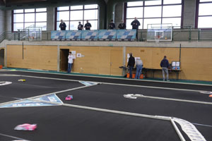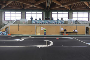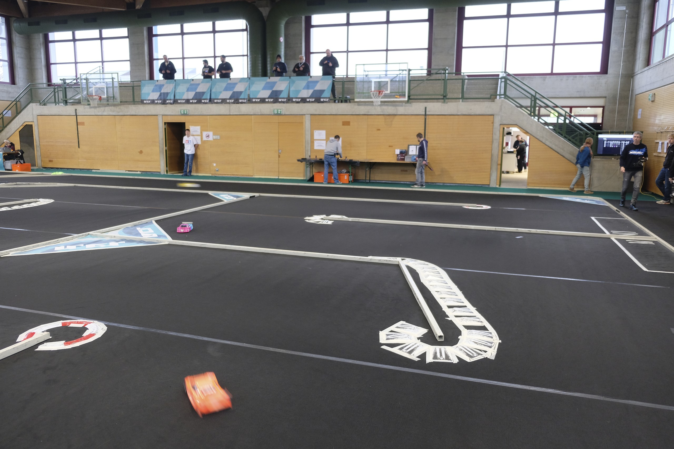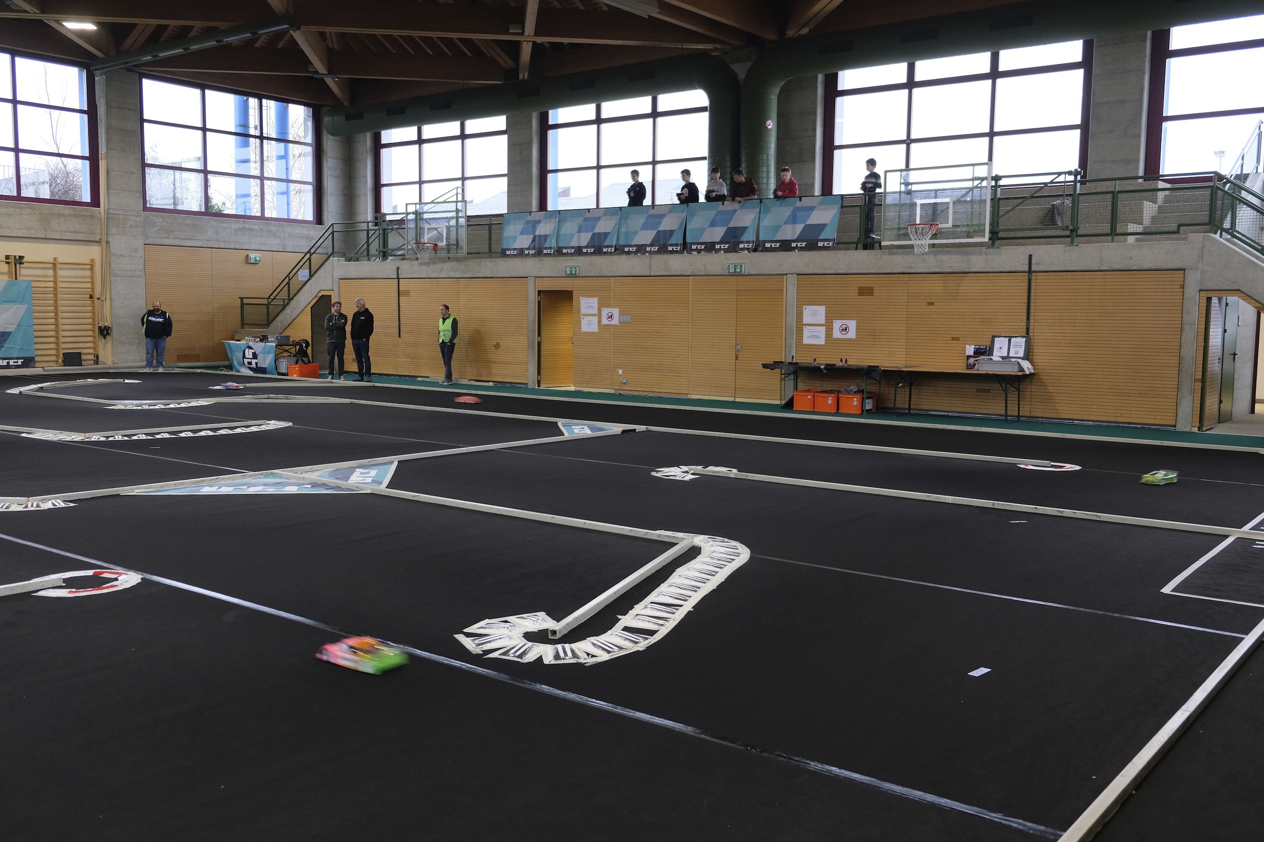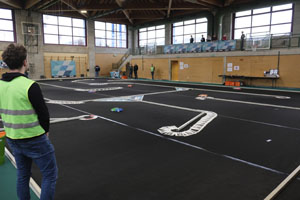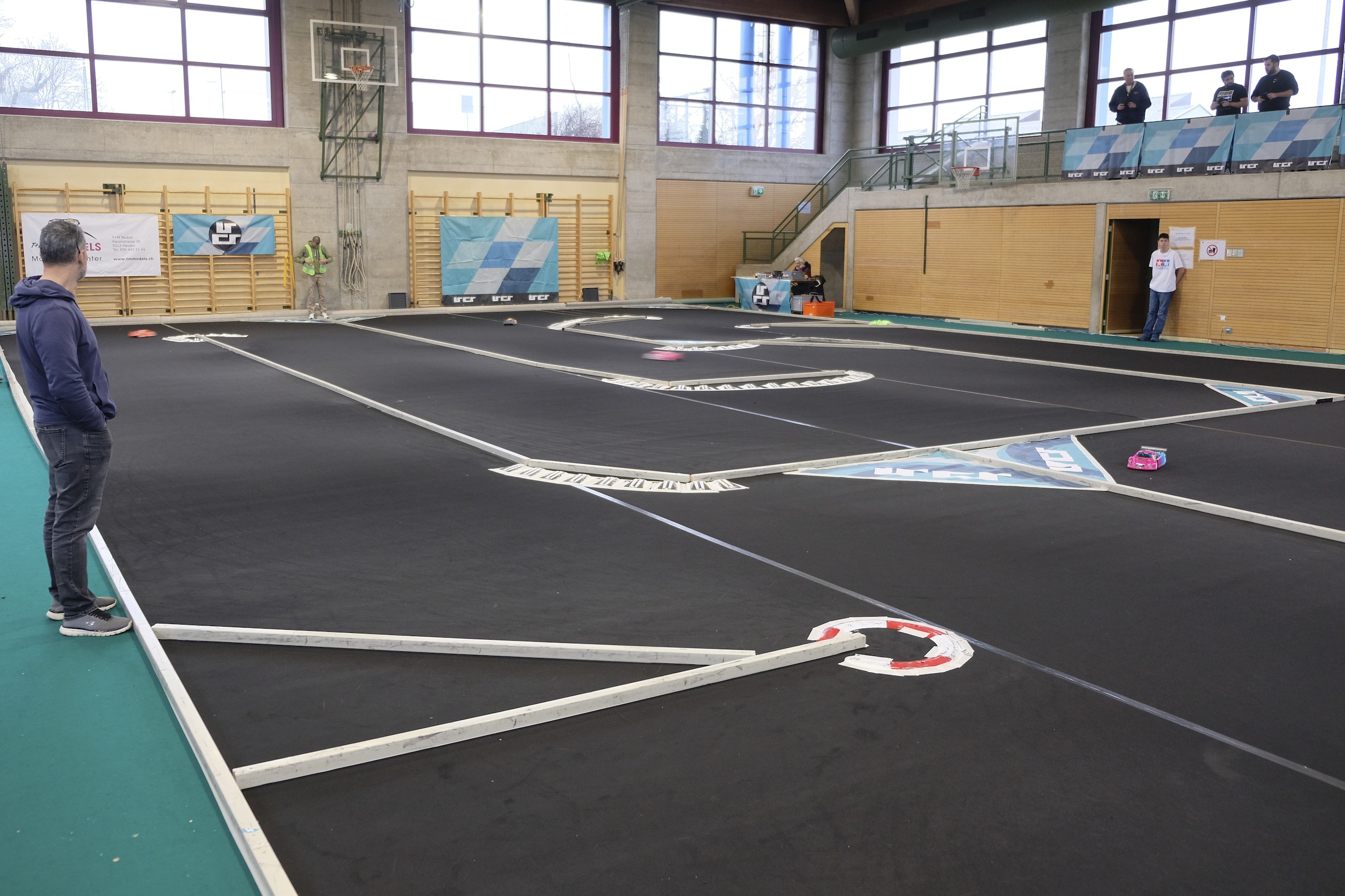 Le règlement officiel se trouve à l'adresse suivante: https://ircr.ch/competitions/ Le samedi après-midi est consacré au montage de la piste jusqu'à 14h00 environ et ensuite aux essais libres (avec une tranche de un quart d'heure toutes les heures prévue pour les pilotes débutants), et le dimanche à la course, avec quatre manches de qualification et trois de finale. La piste.La moquette est toujours de type ETS, achetée chez le fournisseur officiel RC-Carpet.com aux Pays-Bas pour le début de la saison 2024-2025. Le balisage modulable est toujours constitué de poutres en profilé GEHR 50x50x4mm en PP et d'éléments de connexion semi-rapide et de vibreurs moulés spécifiques, associés à du balisage "Track KERBS System" du fabricant japonais Team Tetsujin. Pour cette première manche, un tracé pratiqué dans le sens horaire avait été choisi. La ligne de comptage se situait dans la courbe du coin droit de la piste, du point de vue du podium. Cette courbe débouchait directement sur une chicane suivie d'une ligne droite au pied du podium. Cette dernière enchainait sur un premier virage serré à droite à 180°, un second à gauche, , puis une plus grande remontée à droite menant à une autre chicane débouchant sur une ligne droite. Après celle-ci, s'enchainent un virage serrée à 180° à droite, un court bout droit suivi d'un grand virage à gauche à plus de 200° qui débouche sur un court bout droit, puis un plus grand virage à droite qui plonge vers la liigne de comptage. |