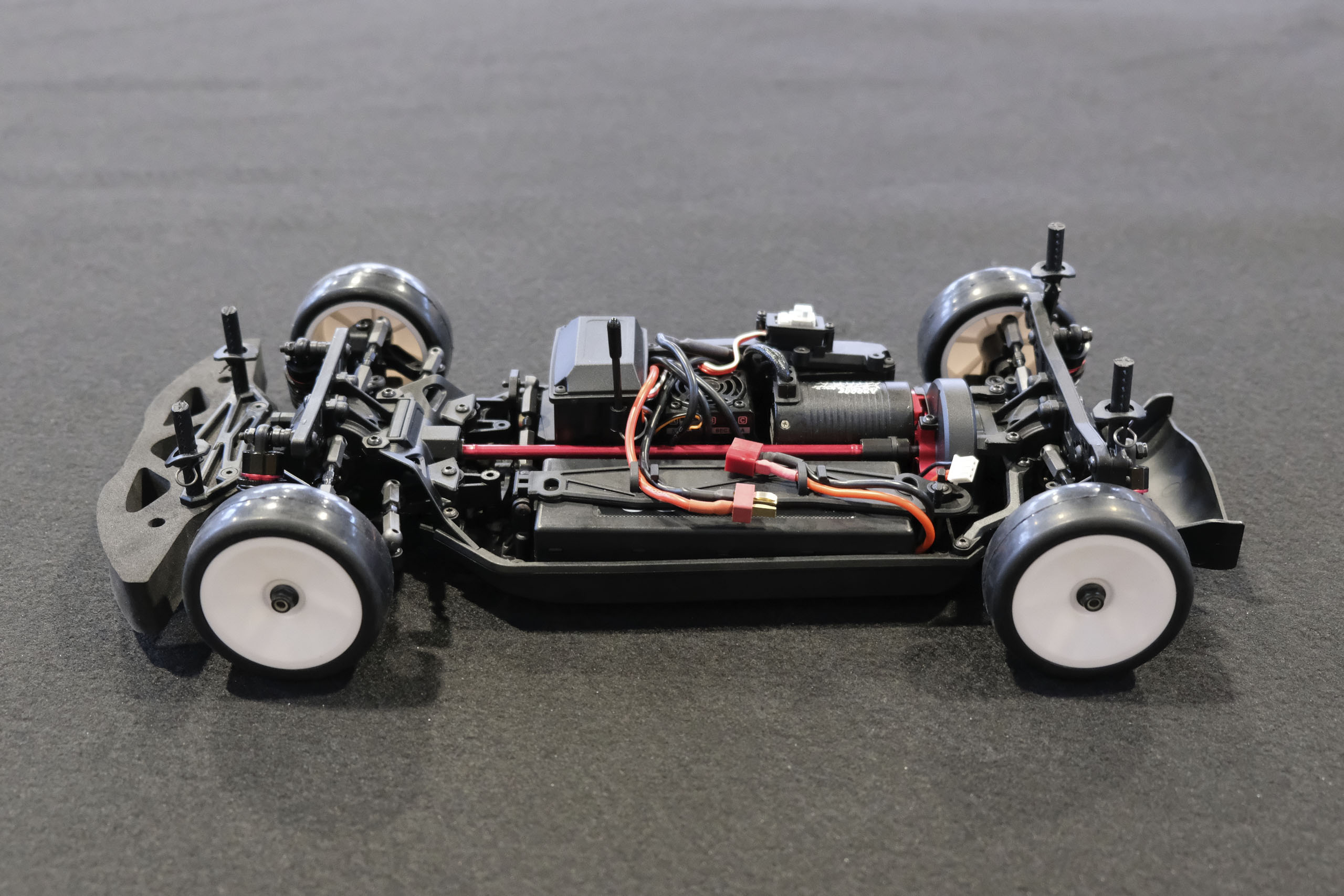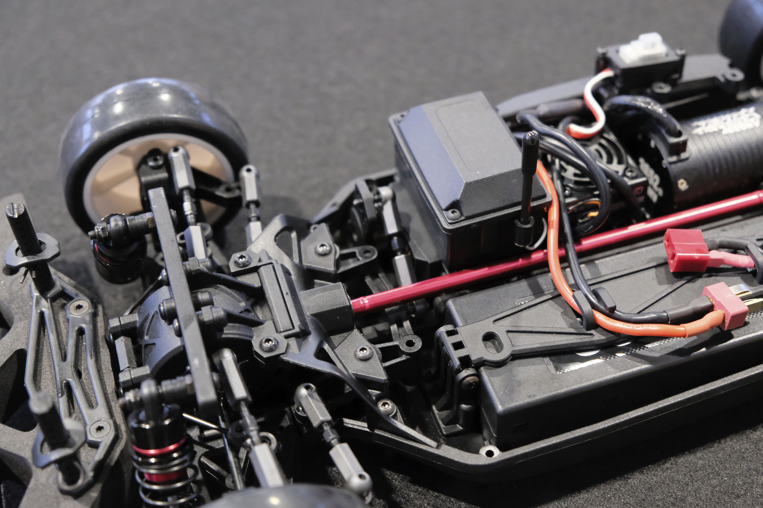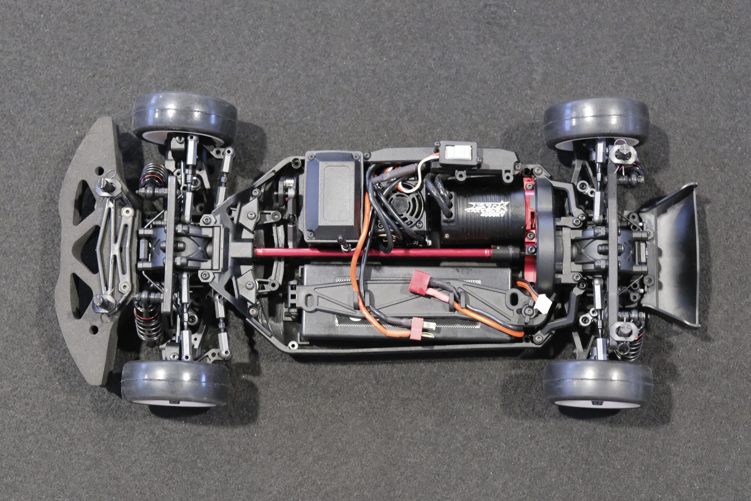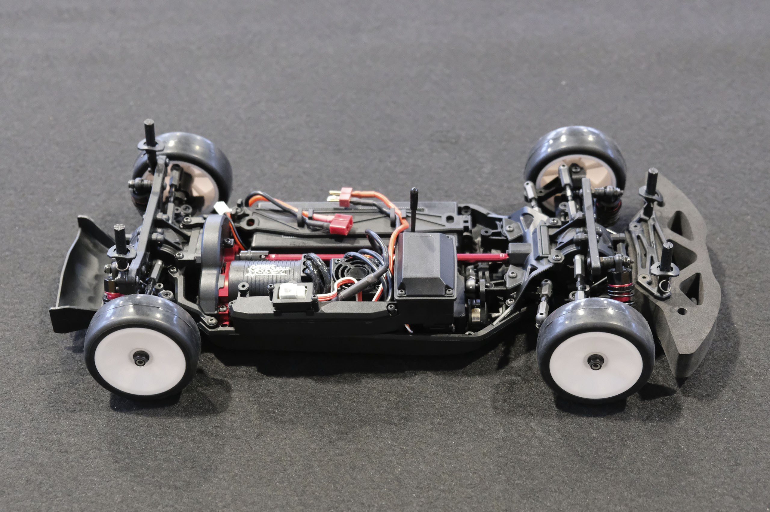 Tout d'abord, un grand merci à Xavier qui m'a confié son auto pour ces séances photos! Xavier, manager du magasin français The Hobbies Gate, m'a présenté ce nouveau châssis Touring 1/10° électrique entrée-de-gamme de la marque WEXRC, la Coupe, qui se présente sous forme RTR, soit en configuration avec un moteur à charbons, soit en configuration avec un moteur brushless sensorless. Une version kit à monter devrait suivre bientôt. La version en configuration avec un moteur brushless sensorless est livrée avec une petite radiocommande 2.4GHz, un servo de direction annoncé à 6kg, un contrôleur brushless de 50A et son moteur associé annoncé à 4000kV (toutes ces valeurs n'étant pas normalisées, elles n'ont qu'une fonction indicative), une batterie 7.4 V 2000 mAh avec boîtier rigide, et un chargeur USB (très léger, mais qui a le mérite d'être livré). Elle est proposée aux alentours de 270€ dans cette configuration. A priori, le châssis en tant que tel a l'air très sympathique, avec une conception soignée, et un équipement fourni (amortisseurs à huile avec corps en aluminium, biellettes à pas inversé, barres anti-roulis, cardan central en aluminium, etc.). Dans la futur version kit à monter, elle pourrait constituer une bonne option pour les petits budgets souhaitant s'initier à la compétition. A suivre de près donc! |