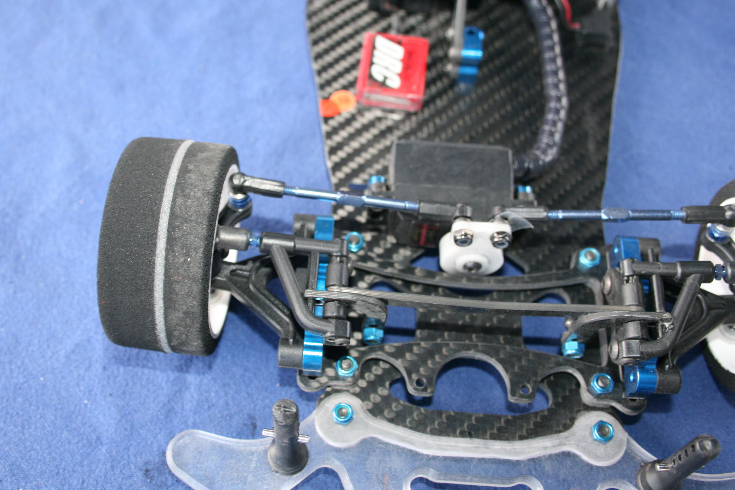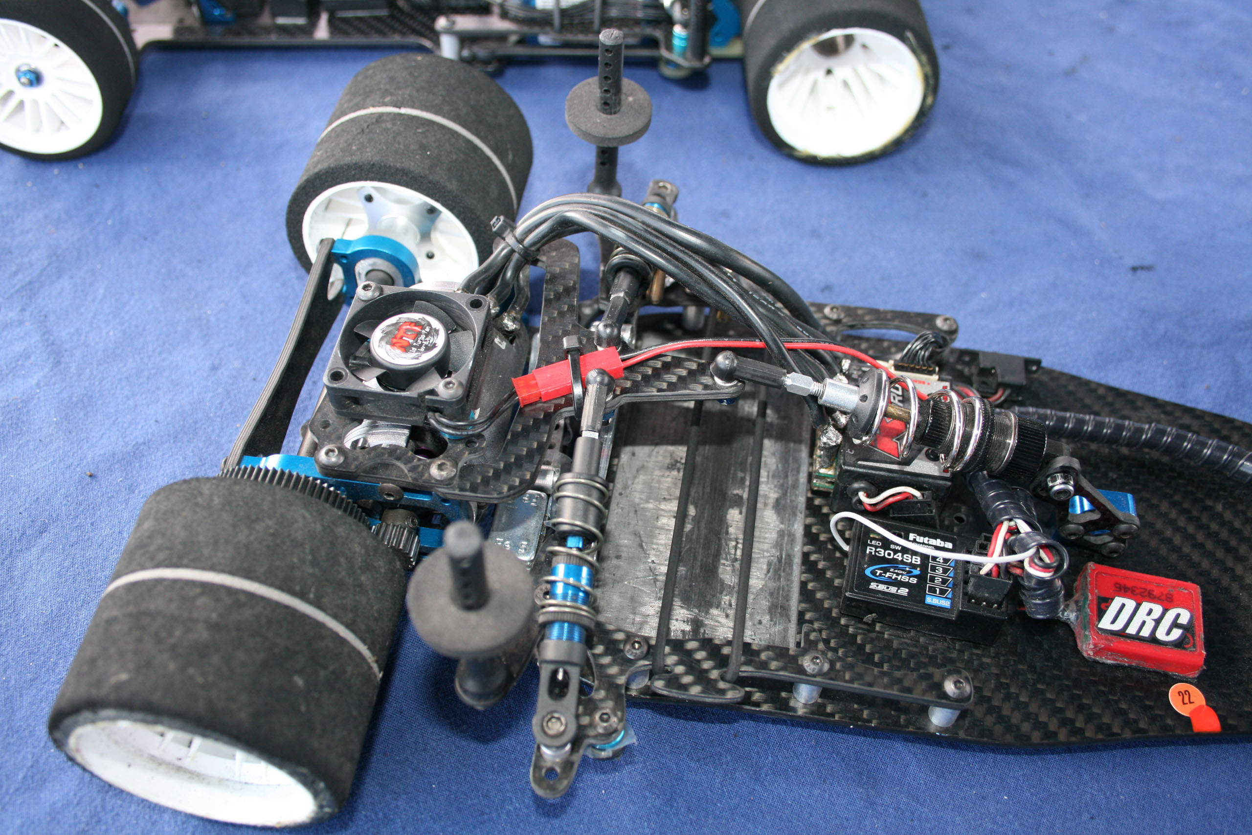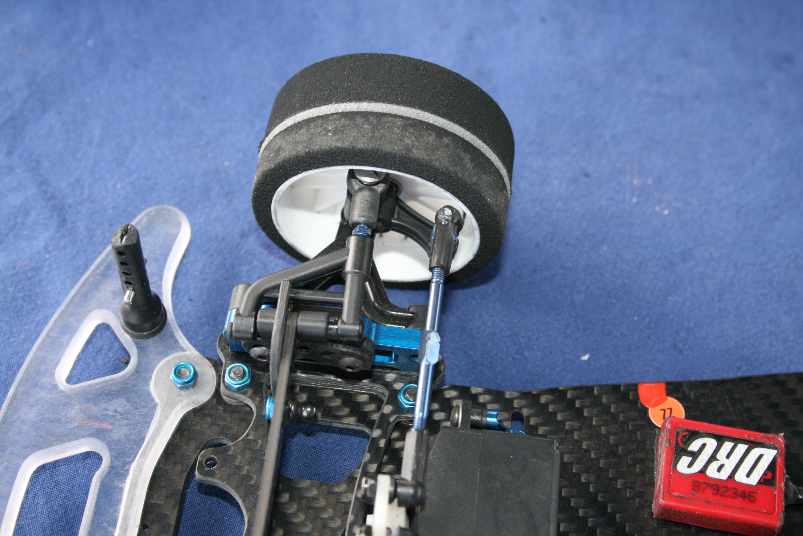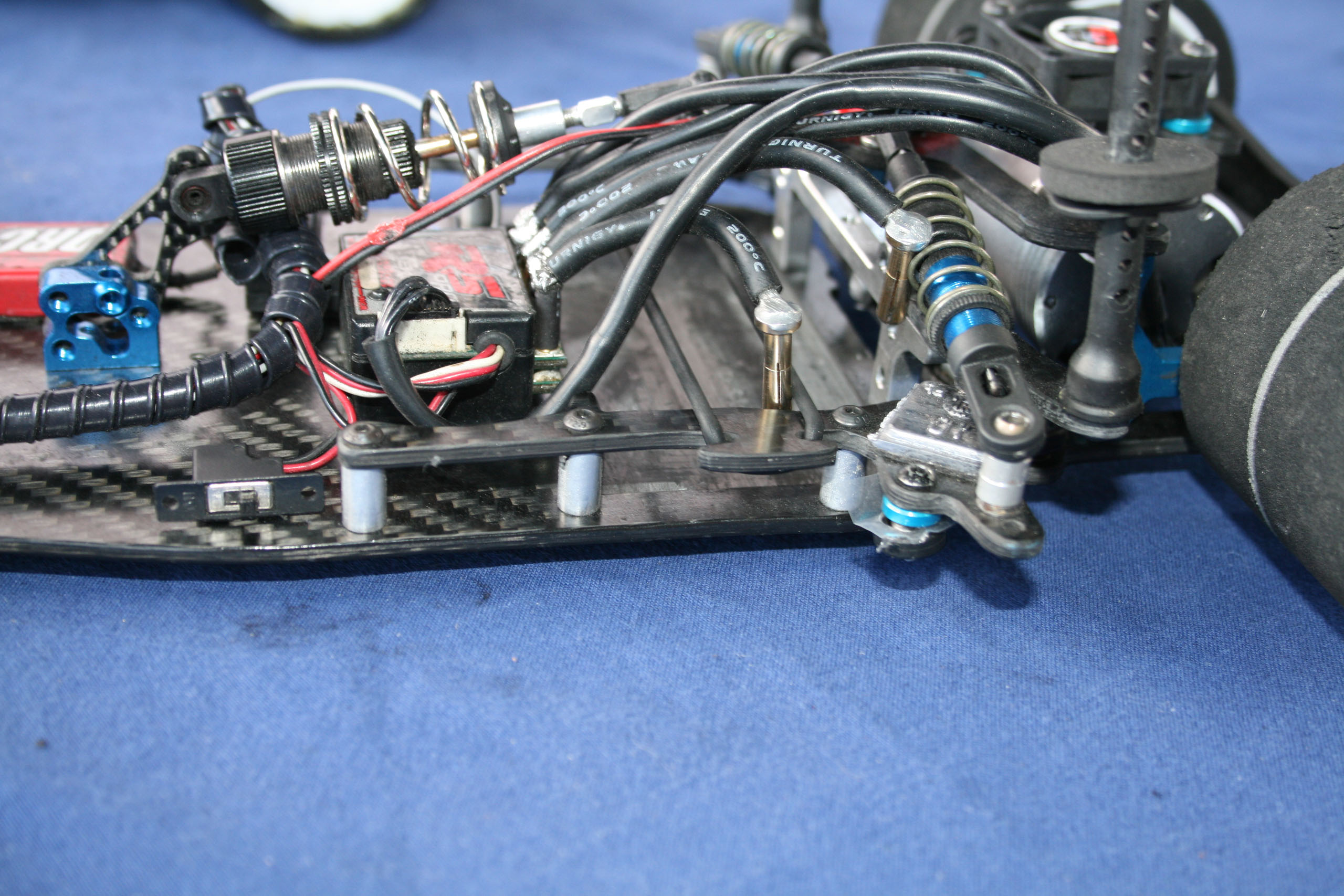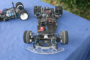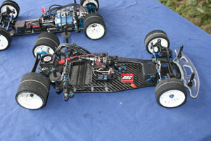 Cette réalisation d'Andi Frattaroli était piloté lors de la troisième manche du Championnat Suisse 2017 à Genève par son propriétaire, Simon Del Monego. Par rapport à la version "Evo" présentée sur cette page en lien ici, elle est de facture plus traditionnelle au niveau de la direction et du train avant. Le train avant est basé sur des demi-trains avant d'origine Team Associated, probablement empruntés à une RC10 R5.1, et est rigidifié par une barre en fibres de carbones les reliant. Le châssis, naturellement de facture personnelle, est secondé par deux renforts latéraux. L'articulation du train arrière reprend le système des prototypes Ascari/Hatzenbach d'Achim Schulz. Ce système comporte quatre biellettes, dont deux latérales et deux transversales, et est dénommé "V-Link". Ainsi est créé un point de rotation virtuel qui permet de placer le centre de roulis très bas et de le régler facilement en faisant varier l'inclinaison des biellettes transversales. Pour plus d'informations historiques sur ce système de suspension, il convient de se référer aux pages dédiées de l'indispensable site RC-Car Museum.de. Plusieurs réalisations d'Andi Frattaroli avaient déjà été présentées sur OverRC.com, à l'image de la T-Bird en 2010, de la Falcon F1 et de la Falcon Vs en 2012 par exemple. Ses réalisations sont commercialisées en très petites séries, et fabriquées à la demande. Pas de site internet à jour pour le moment, tout se passe sur sa page Facebook. |