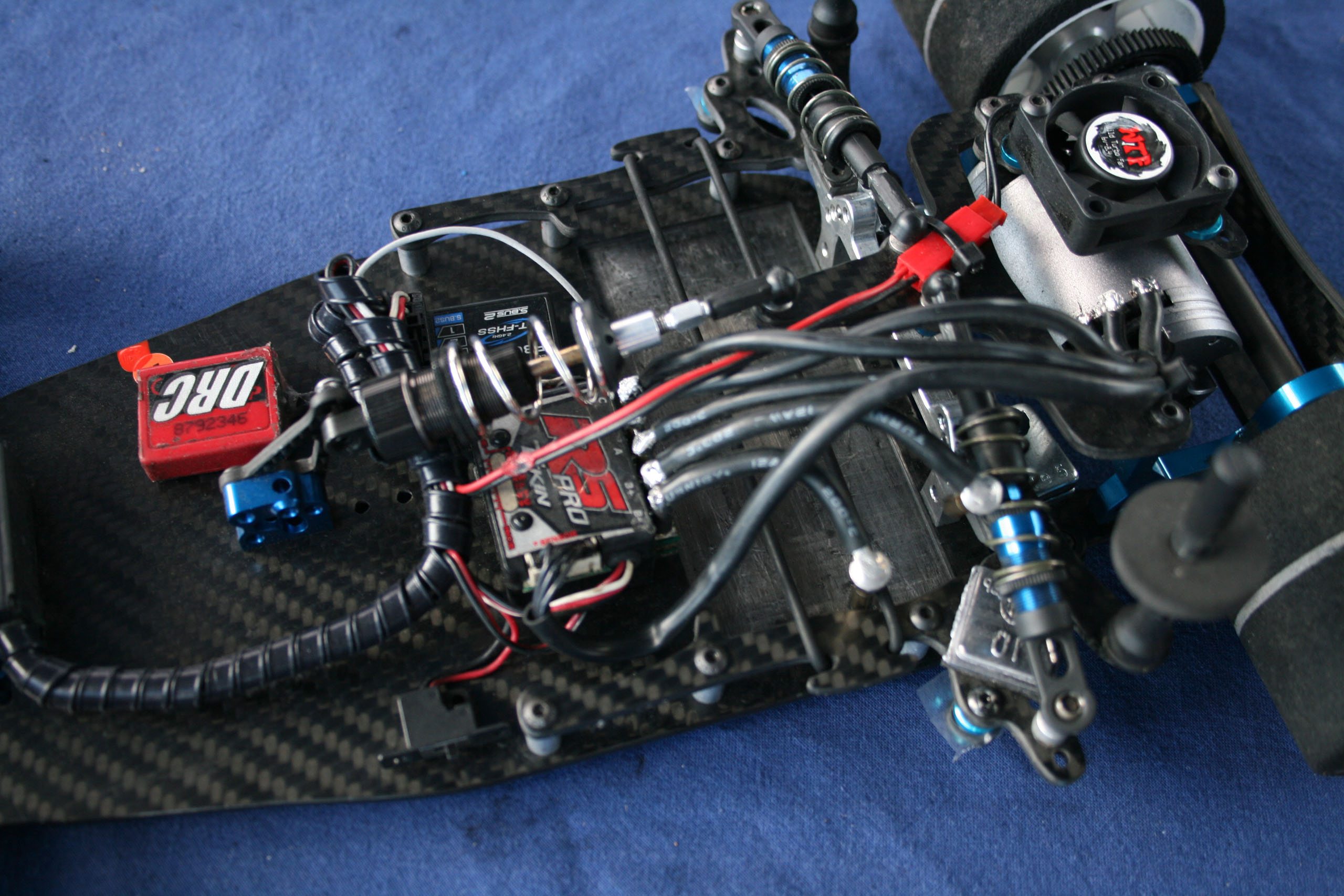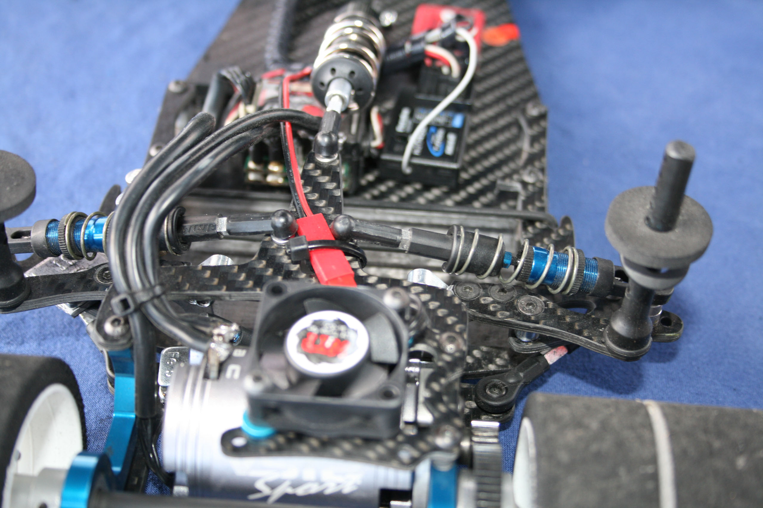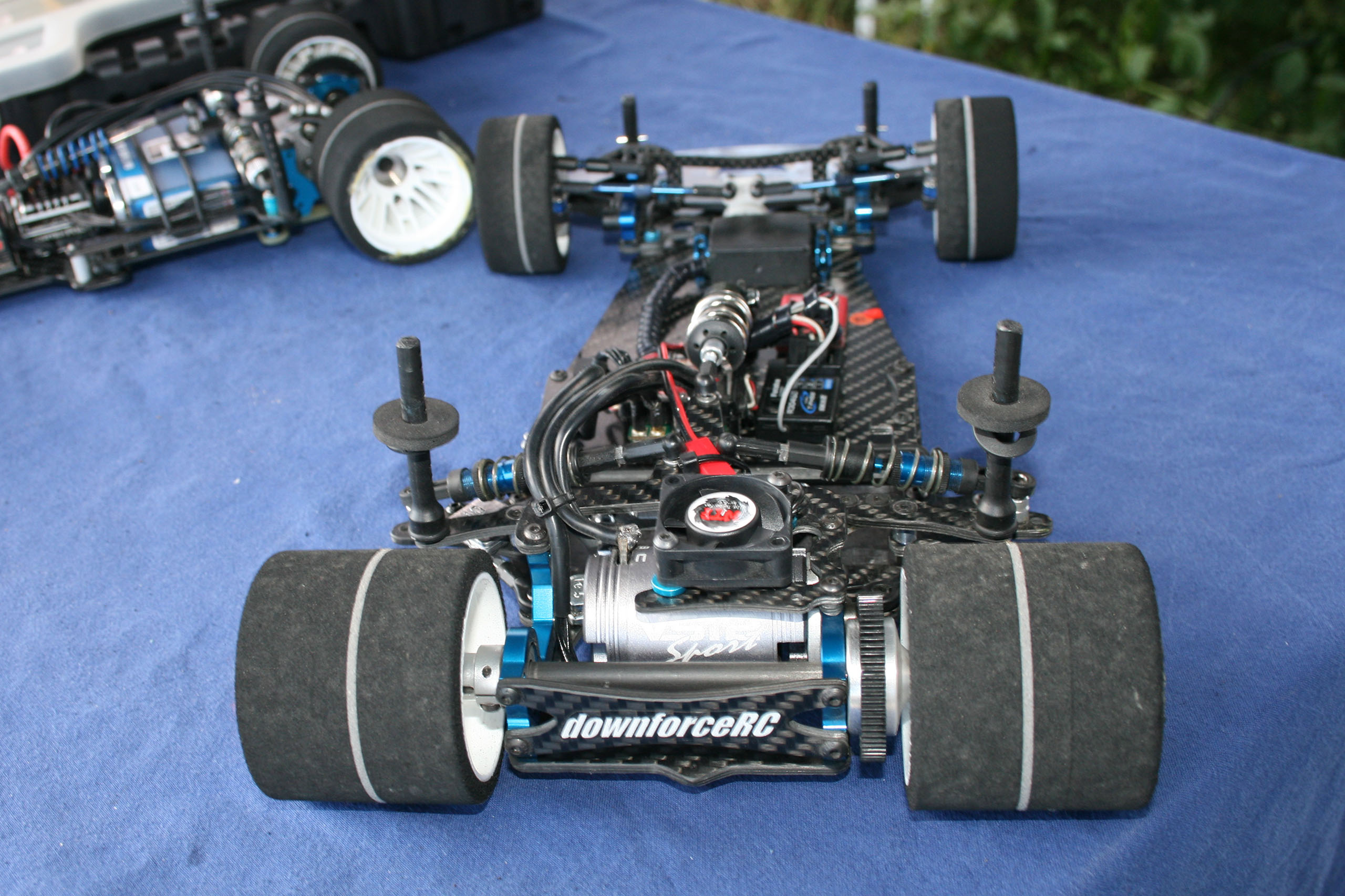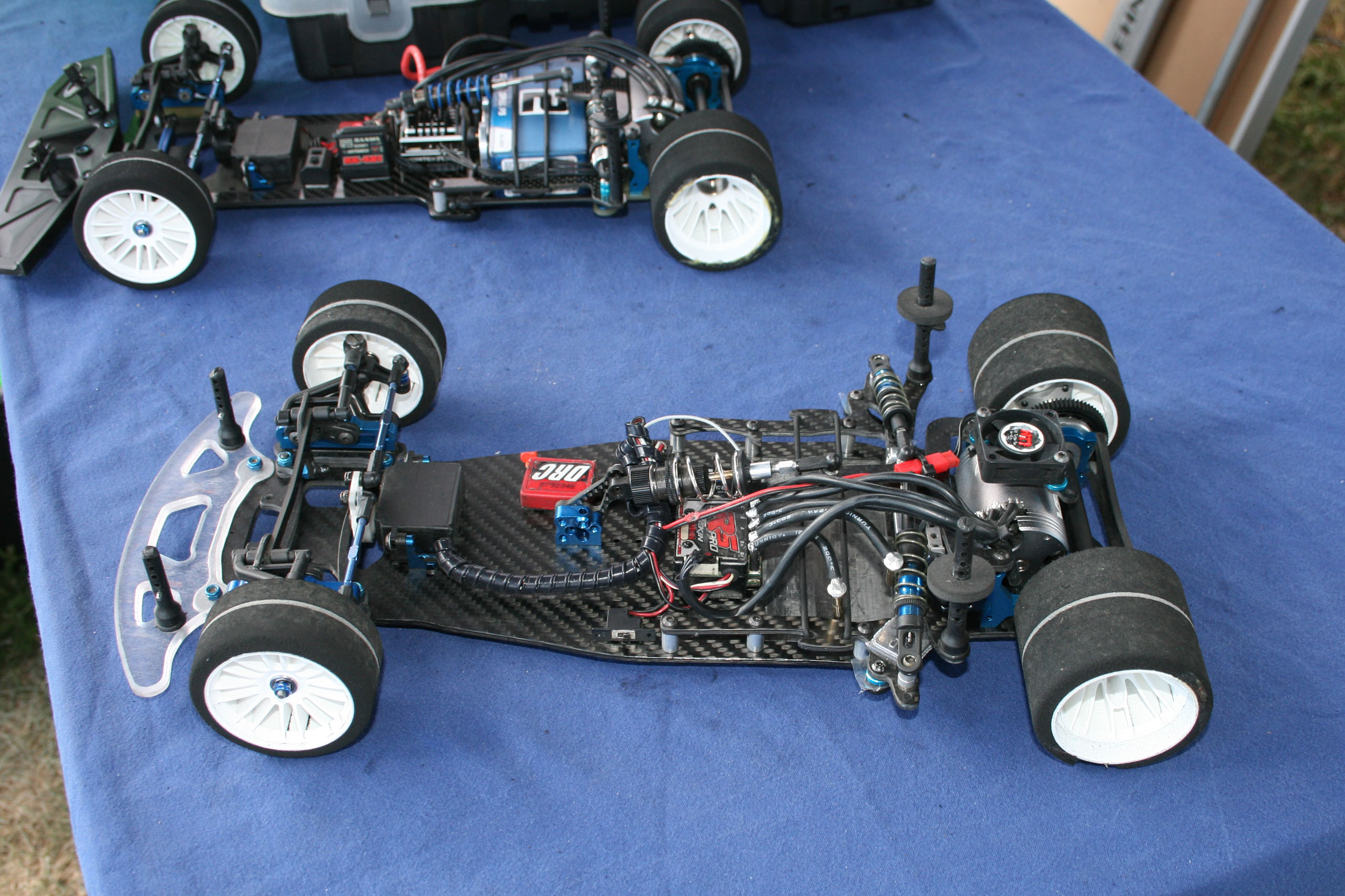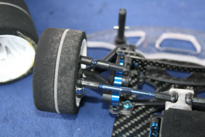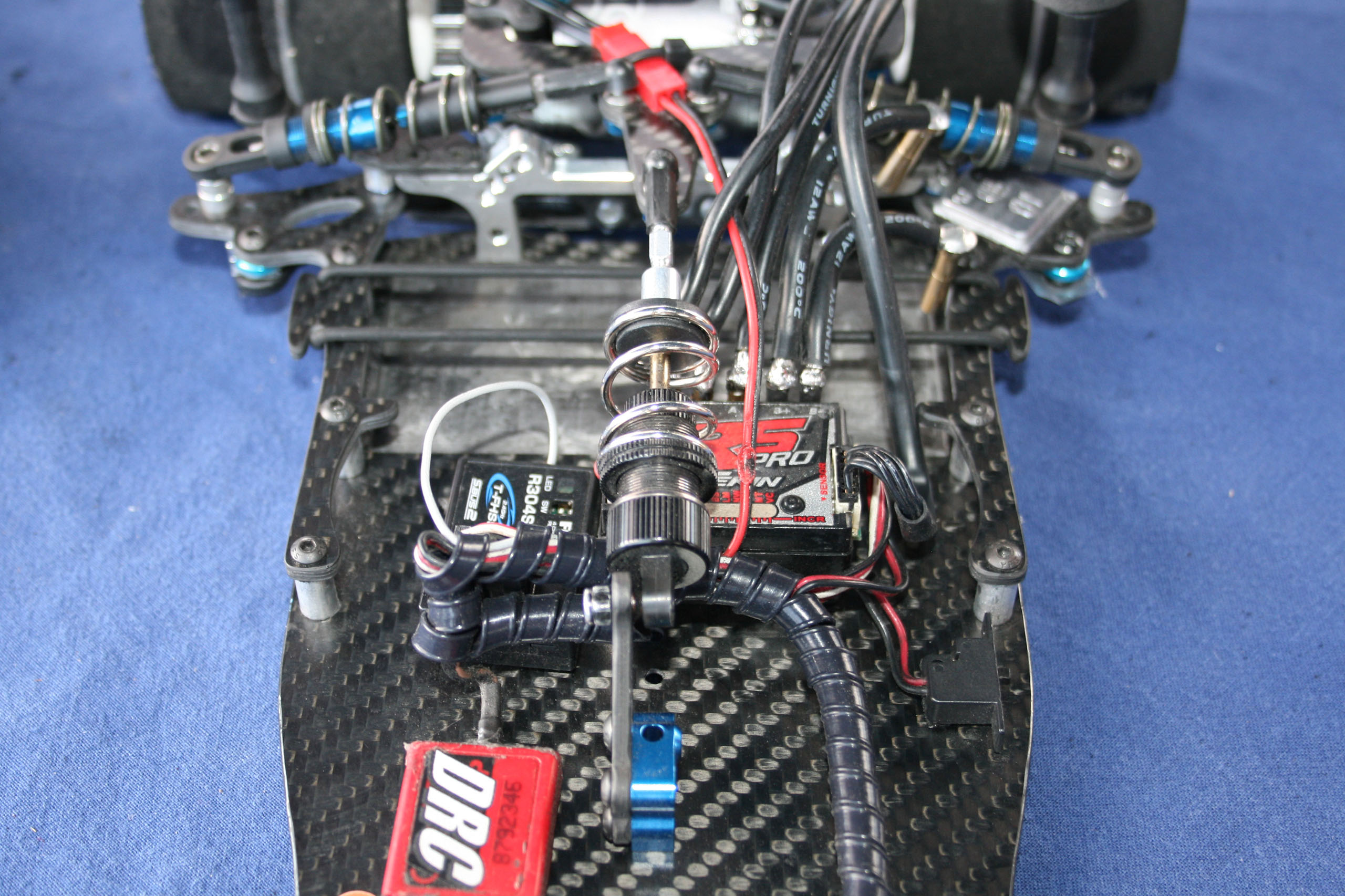 Cette réalisation d'Andi Frattaroli était piloté lors de la troisième manche du Championnat Suisse 2017 à Genève par son propriétaire, Simon Del Monego. Par rapport à la version "Evo" présentée sur cette page en lien ici, elle est de facture plus traditionnelle au niveau de la direction et du train avant. Le train avant est basé sur des demi-trains avant d'origine Team Associated, probablement empruntés à une RC10 R5.1, et est rigidifié par une barre en fibres de carbones les reliant. Le châssis, naturellement de facture personnelle, est secondé par deux renforts latéraux. L'articulation du train arrière reprend le système des prototypes Ascari/Hatzenbach d'Achim Schulz. Ce système comporte quatre biellettes, dont deux latérales et deux transversales, et est dénommé "V-Link". Ainsi est créé un point de rotation virtuel qui permet de placer le centre de roulis très bas et de le régler facilement en faisant varier l'inclinaison des biellettes transversales. Pour plus d'informations historiques sur ce système de suspension, il convient de se référer aux pages dédiées de l'indispensable site RC-Car Museum.de. Plusieurs réalisations d'Andi Frattaroli avaient déjà été présentées sur OverRC.com, à l'image de la T-Bird en 2010, de la Falcon F1 et de la Falcon Vs en 2012 par exemple. Ses réalisations sont commercialisées en très petites séries, et fabriquées à la demande. Pas de site internet à jour pour le moment, tout se passe sur sa page Facebook. |